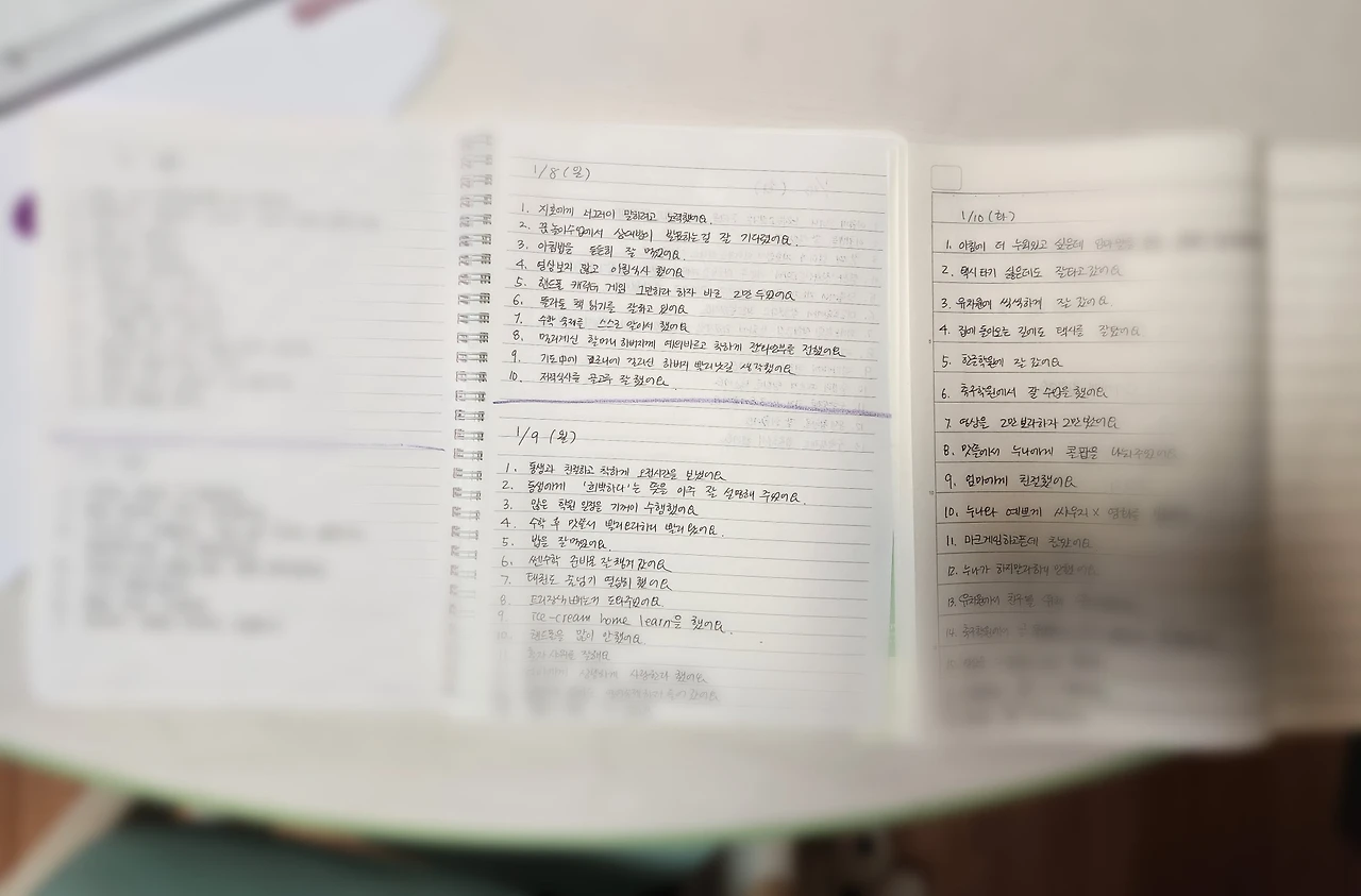 내가 그토록 불만스러웠던 나와 다른 아이의 하루에는 이토록 많은 칭찬들이 담겨있었다. 내가 보았던 시선이 얼마나 편협하고 자기중심적인지 새삼 깨닫는다. 알고 있었지만 보이지 않던 것들이 가시적으로 그것도 나의 손글씨로 쏟아지듯 보이는데 정신이 번쩍 들었다.