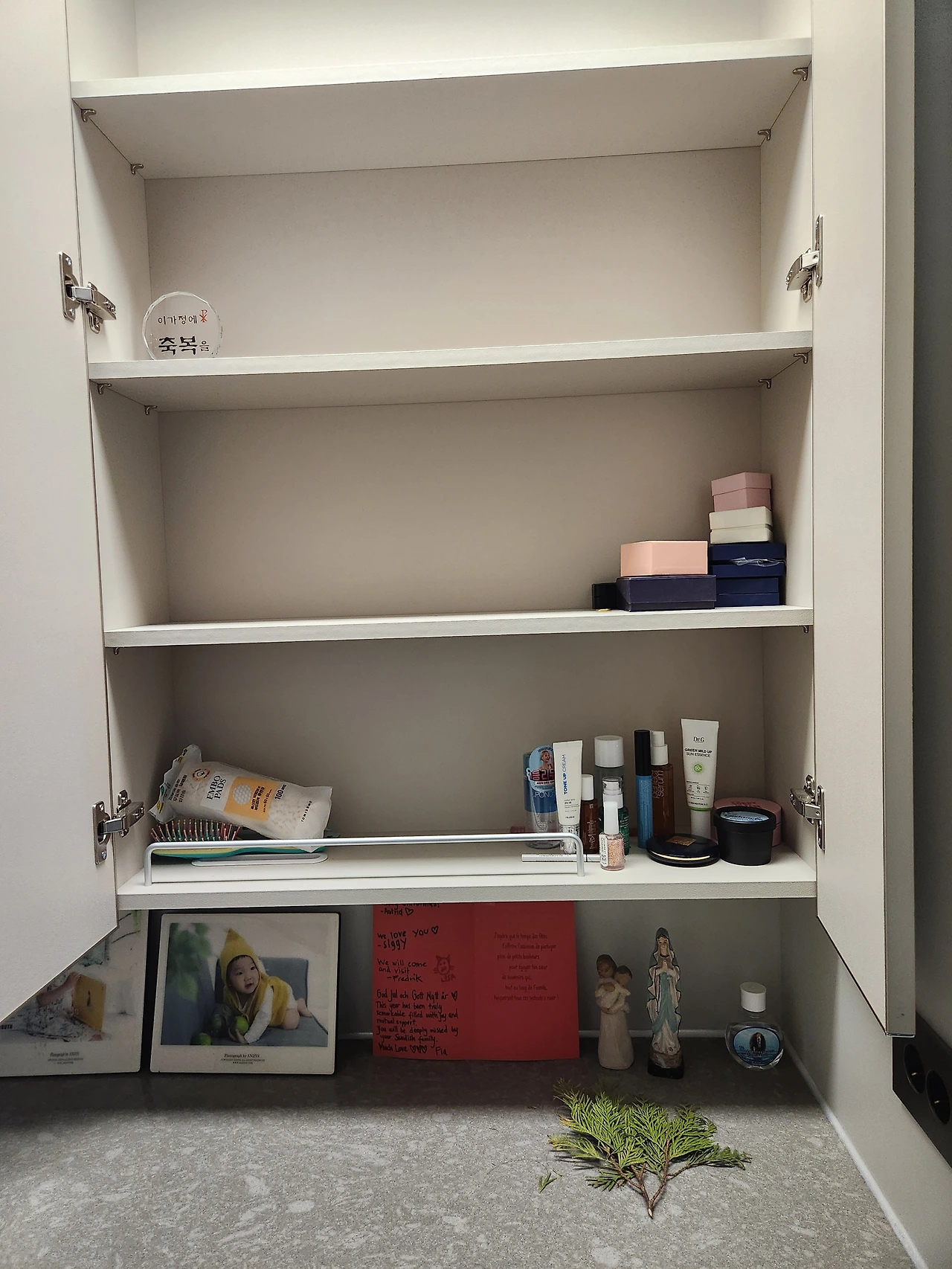화장대의 거울문을 열어보면 선크림 하나, 에센스 두어 개, 아이크림 하나, 매니큐어 하나, 아이라이너 하나가 메이크업 용품의 전부다. 예의를 차려야 하는 공간에서 간단하게 할 수 있는 액세서리인 귀걸이 몇 개만 남기고 전부 비운 화장대는 어찌 보면 조금 초라해 보이기도 한다.