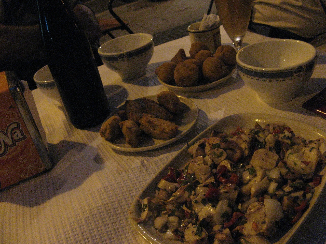 방으로 돌아와 얼마간 낮잠을 즐기고 일어나니 어두운 밤이다. 좀 늦긴 했지만 체력 유지를 위해서는 굶고 잘 수는 없다. 다시 밖에 나가 저녁거리를 찾는다. 일행이 주문한 저녁은 닭고기 크로켓(Croquetes), 바칼라우(Bacalhau) 튀김, 문어(Polvo) 요리. 이렇게 시켜서 다 같이 나누어 먹었다. 이들도 때로는 이렇게 나눠 먹기도 하는구나. 아마 국물이 없어 깔끔하게 가져갈 수 있는 음식이니까 그렇겠지.