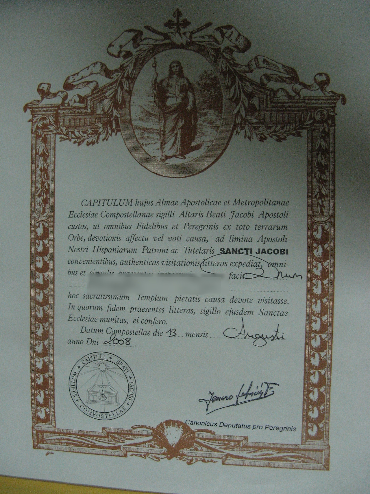 순례 증명서(콤포스텔라). 산티아고까지의 마지막 100km 구간을 걸었다는 것이 확인되면 발급해 준다. (자전거로는 200km 이상). 나처럼 포르투에서 산티아고까지 걸으면 200km가 넘기 때문에 당연히 받을 수 있고, 포르투갈길 중 스페인 첫 도시인 Tui에서 시작하면 100km를 간신히 넘으니 자격이 된다. 증명서에 뭐라고 글자가 많이 쓰여있는데 날짜와 내 이름 말고는 그다지 알아먹는 내용이 없다는 게 문제네.