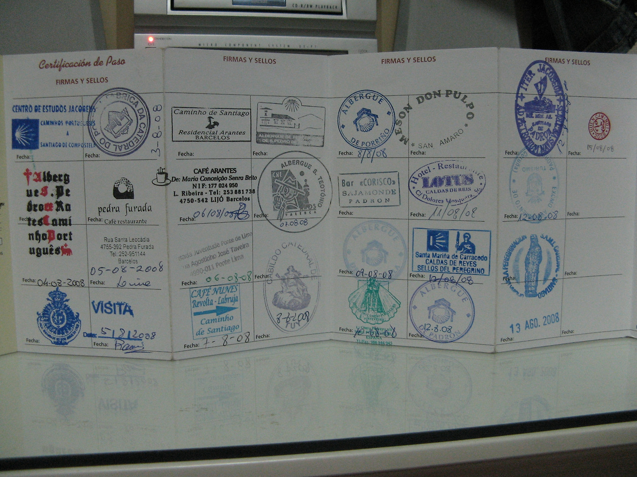 순례자 여권(크레덴시알). 도장은 알베르게, 성당, 카페 등에서 받은 것. 꼼꼼히 받은 도장으로 내가 이 길을 진짜 걸었음을 증명해야 순례 증명서를 받을 수 있다. 제일 마지막에는 산티아고에서 만난 다른 한국인 순례자에게 받은 개인 도장이. 저 도장 받은 후에야 '와 이렇게 좋은 아이디어가' 하는 생각을 했다. 나도 미리 생각해서 도장 하나 만들어 갔으면 길에서 만나는 다른 순례자들과 좋은 추억거리가 되지 않았을까. (이 글을 보고 떠나시는 분이라면 한 번쯤 생각해 보시길)