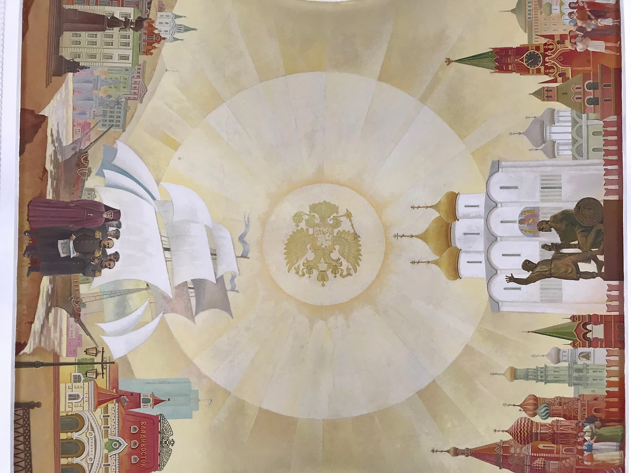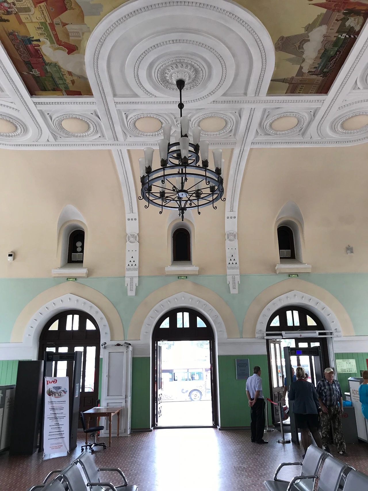 블라디보스톡역 내부우리는 100% 자유여행으로 다녔는데, 블라디보스톡역에는 가이드 투어를 하는 서양인들 한 무리를 만났다. 뭔가 천장의 그림에 대해서도, 한쪽 벽에 설치된 누군가의 동상에 대해서도 설명을 해주고 있는데, 궁금했지만 어떤 내용인지 알 수는 없었다. 그래도 사진이라도 찍어가자! ㅎㅎ