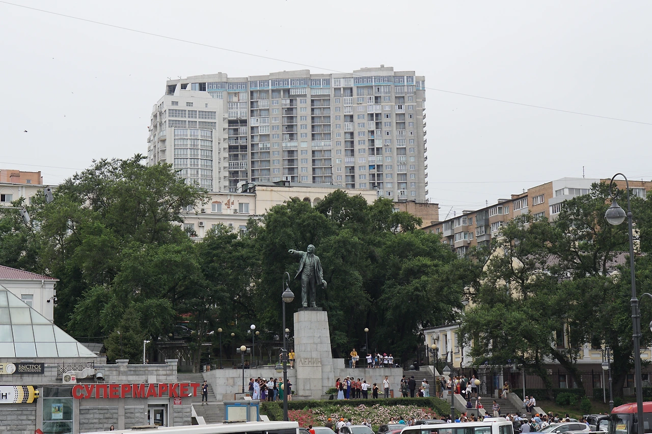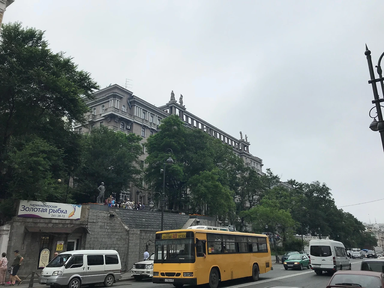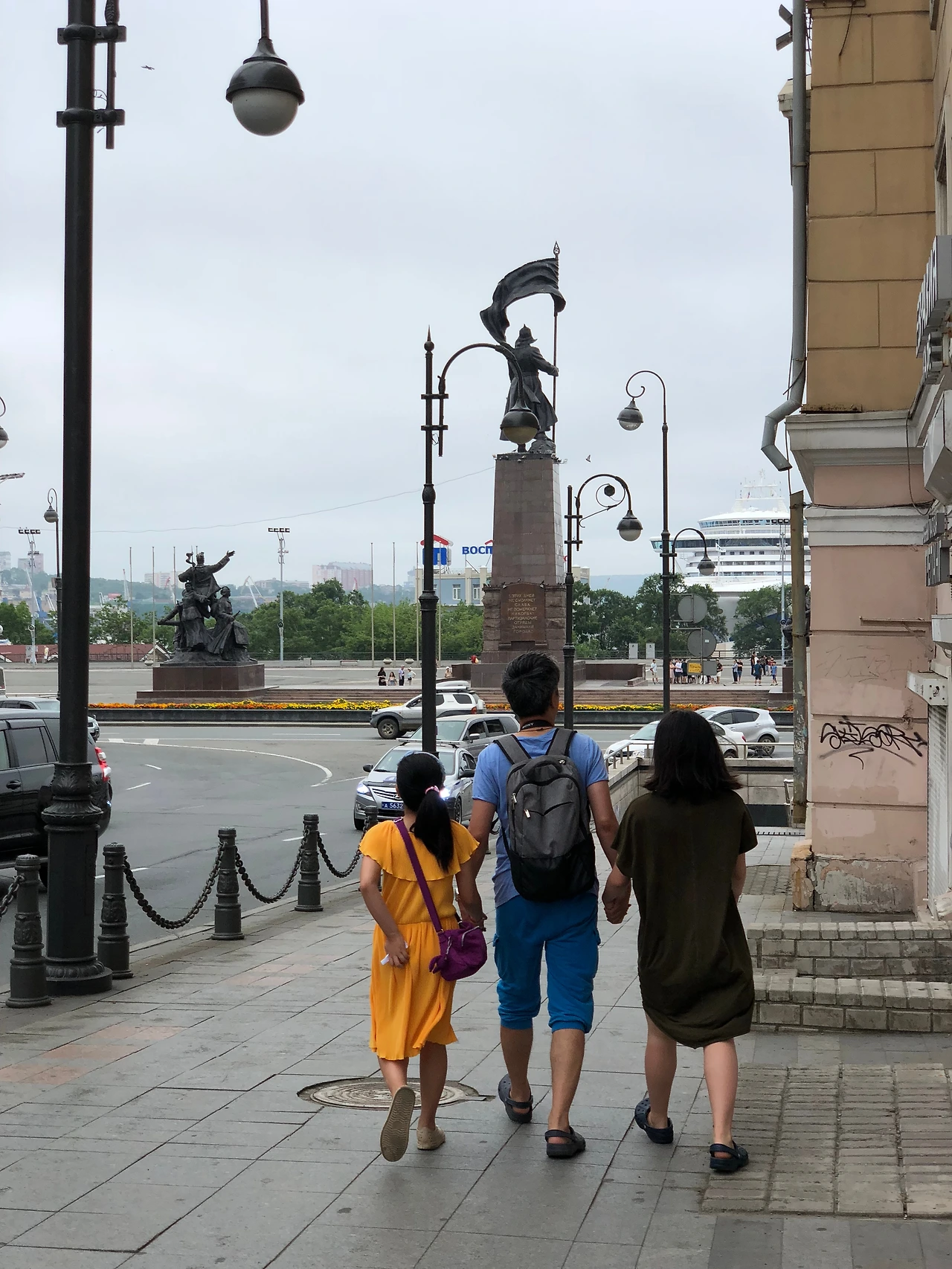 혁명광장 쪽으로 걷는 나와 두 딸혁명광장을 지나 시베리아횡단열차의 시작점이자 종착점인 블라디보스톡 기차역까지 걷는 코스이다. 숙소 위치가 워낙 좋아서, 숙소 앞부터 거리를 재어도 약 1km. 건강한 성인에게는 약 15분 거리로서 크게 부담되는 거리는 아니지만, 아이들과 함께일 때는 아이들 컨디션을 잘 살피며 가야 한다.