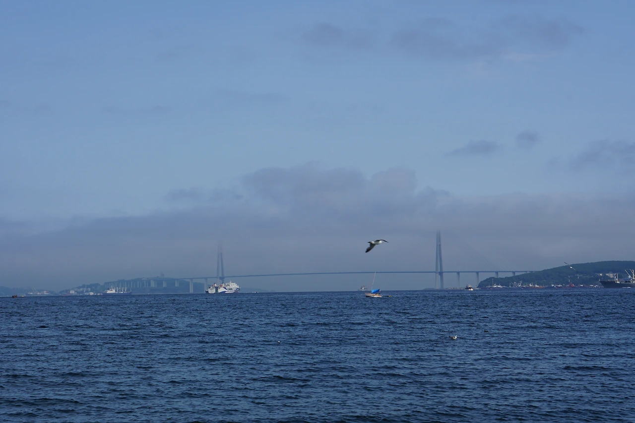 걸으면서 본 루스키 대교걸으면서 왼쪽을 보면 물결치는 바다 너머로 웅장한 루스키 대교가 보인다.