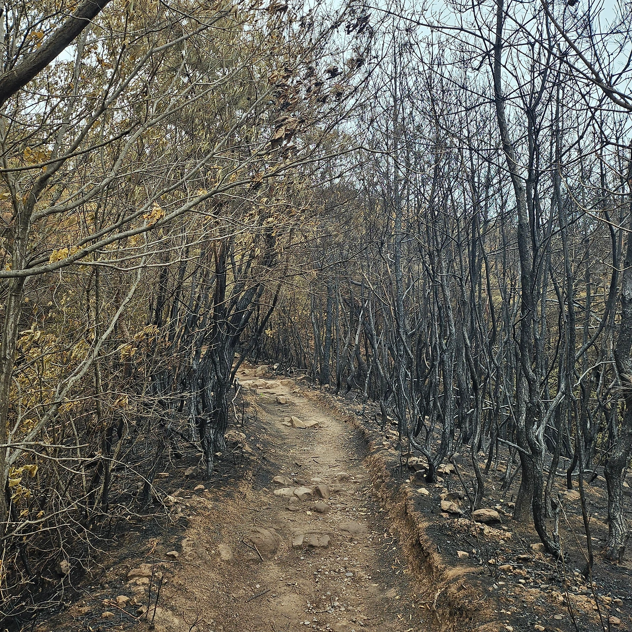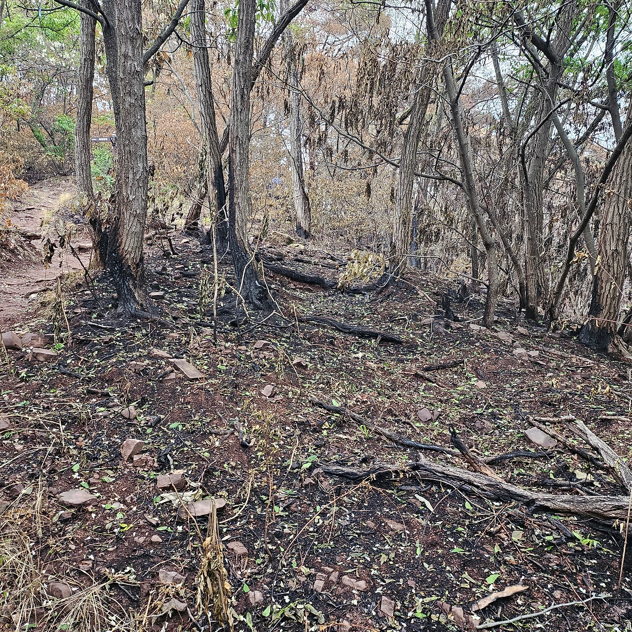 정상에 가까워질수록, 산불이 할퀴고 간 흔적이 더욱 진해졌다. 이 길은 나무가 완전히 다 타버려서 조금 스산하게 느껴지기까지 했다. 등산로는 잘 보존되어 있었지만 탄내가 너무나 자욱해 숨을 쉬기가 불편해서 아쉽지만 이쯤 하고 하산을 하기로 했다. 한창 푸릇해야 할 시기에 시커멓게 다 타버린 모습을 보고 있으니 타버린 나무들에 감정이입이 되어 내 기분까지 살짝 울적해지려는 찰나, 그 까만 재 속에서도 희망이 피어오르는 모습을 발견했다.