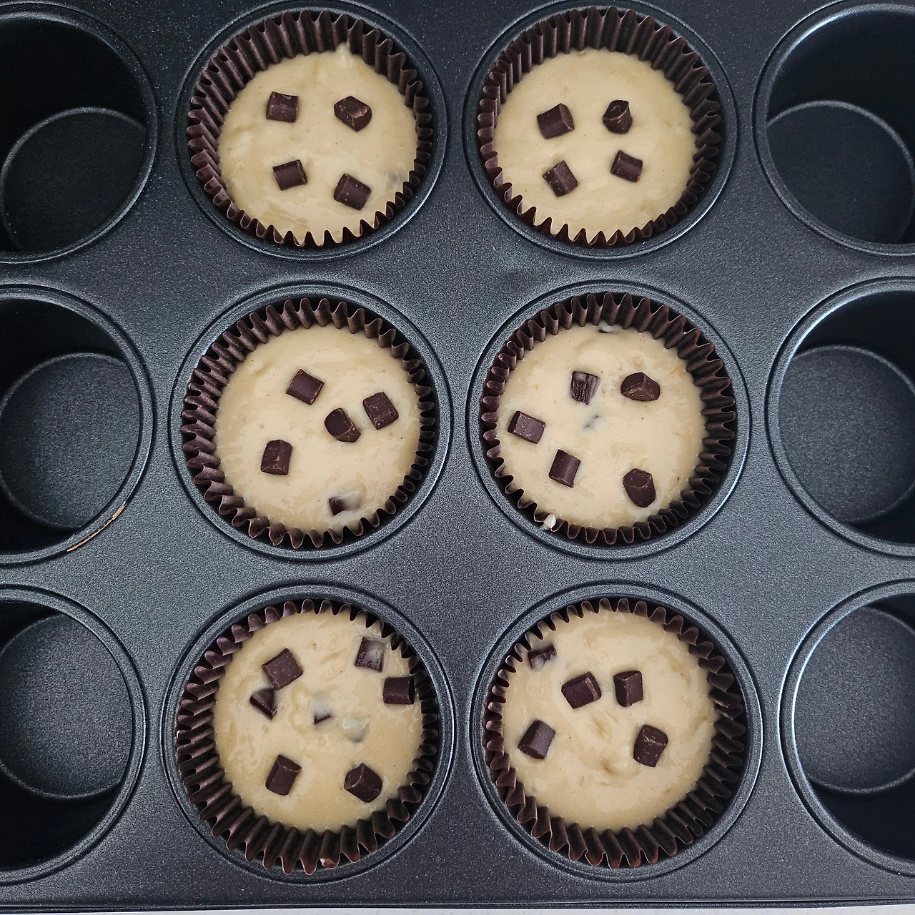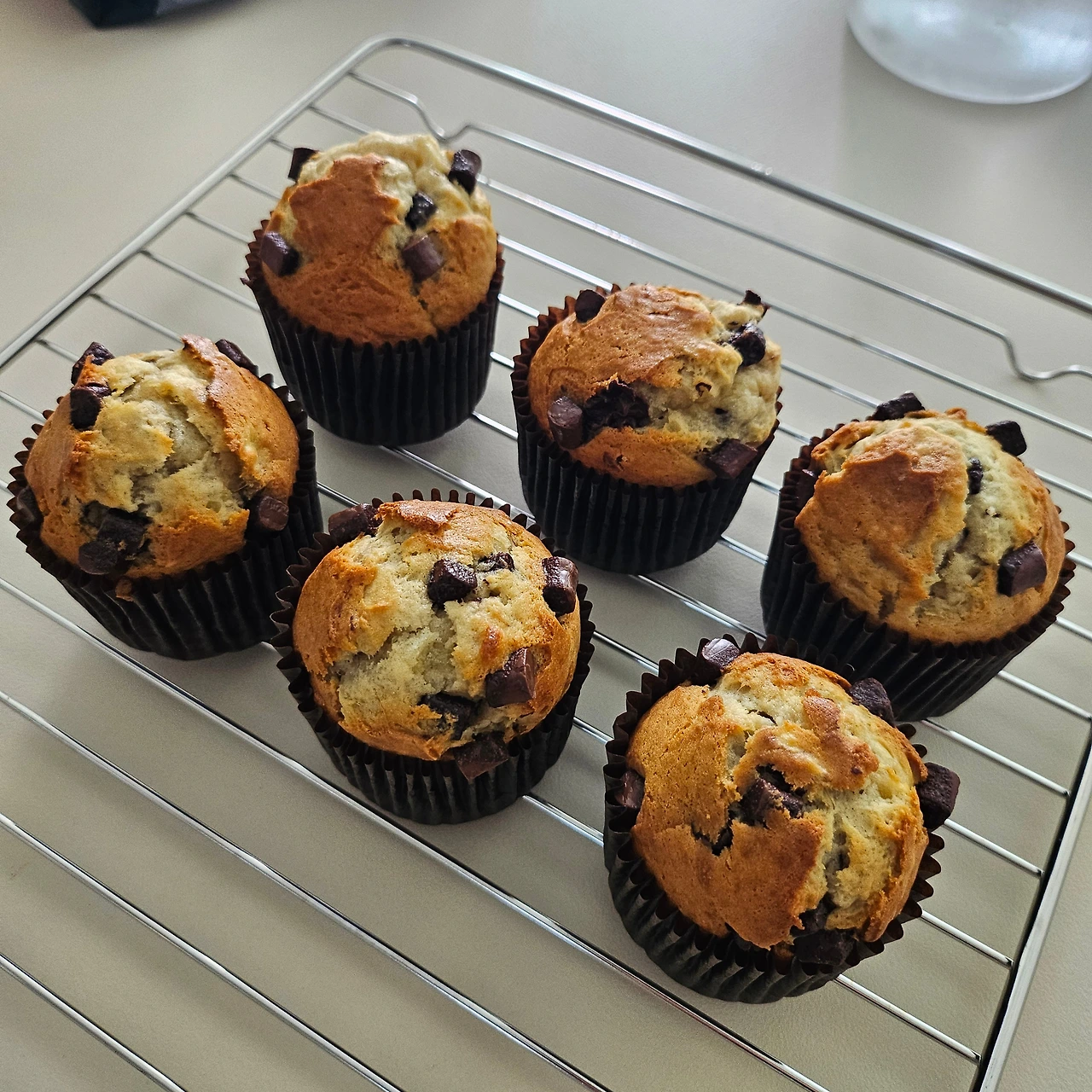 원래 바나나 브레드는 파운드 틀에 굽는 것이 일반적이지만 나는 파운드틀에 굽는 것보다는 머핀틀에 굽는 것을 더 선호한다. 머핀틀에 구우면 귀찮게 잘라서 먹지 않아도 되고 딱 하나씩 먹기 좋게 소분이 되기 때문이다. 굽는 온도는 동일하게 하되 굽는 시간은 파운드 틀에 굽는 것보다 10~15분 정도 줄이면 된다. 물론 꼬챙이로 익었는지 테스트해 보는 게 가장 정확하다. 그리고 또 일반적이지 않은 게 있다면 반죽에 초코칩을 넣은 것. 보통은 바나나브래드에 호두를 많이들 섞는데 나는 견과류를 그렇게 좋아하지 않아서 초코칩을 넣었다. 초코와 바나나, 너무나 멋진 조합!