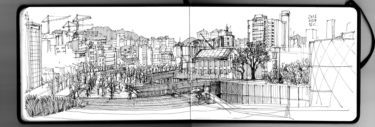 광천동에 있는 신세계 백화점은 물건을 사기위해 방문하지는 않지만 자주 들린다. 주머니 사정이 그리 두둑하지 않고 필기구나 연습장을 팔지도 않으니 잠시 스타벅스들리거나 지나가는 곳. 버스에서 내려 육교를 바라보며 빠르게 그려봤다. 역시 추운날 밖에서 그림은 건강하지 못한 선택이다.
