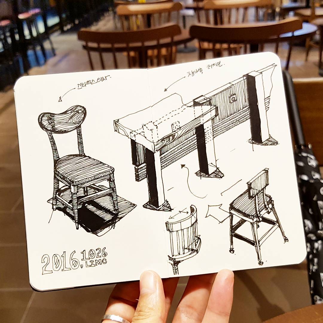 요즘은 의자에 관심이 있어 자주 그리고 있습니다. 주로 이용하는 스타벅스의 의자를 그리지만 기본 형태를 생각하고 응용해서 다른 의자로 만드는 그런 과정도 좋아해요. 겉모습에 치우치지 않는 그런 그림을 그리고 싶지만 현실은 외적인 부분도 서툴러서 가위눌린 기분을 종종 맛보고 있습니다.