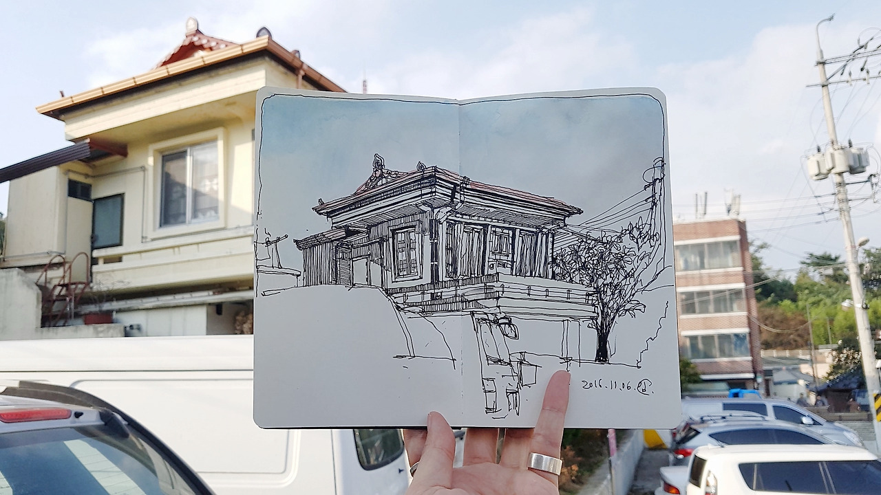 양림동 끝쯤에서 그리기 적당한 건물과 앉을 수 있는 협소한 공간을 발견했습니다. 짐을 풀고 삼각대에 카메라를 올린 다음 슬슬 시동을 걸어봅니다. 밖에서 그리는 그림은 즐겁지만 대부분의 요소들이 그림에 적합하지 않습니다. 자세나 주변 환경의 영향을 많이 받죠. 아직 초보라서 그러겠지만 나중에 고수가 된다면 서서 휘비적휘비적하면 짠~하고 그림이 완성되는 그런 경지를 꿈꿔봅니다.