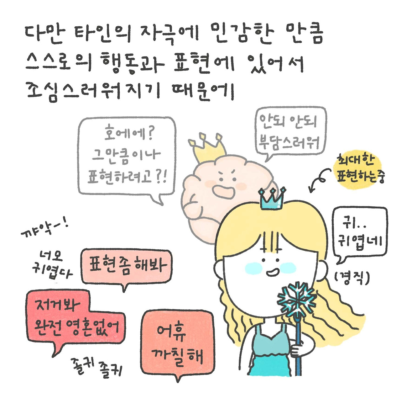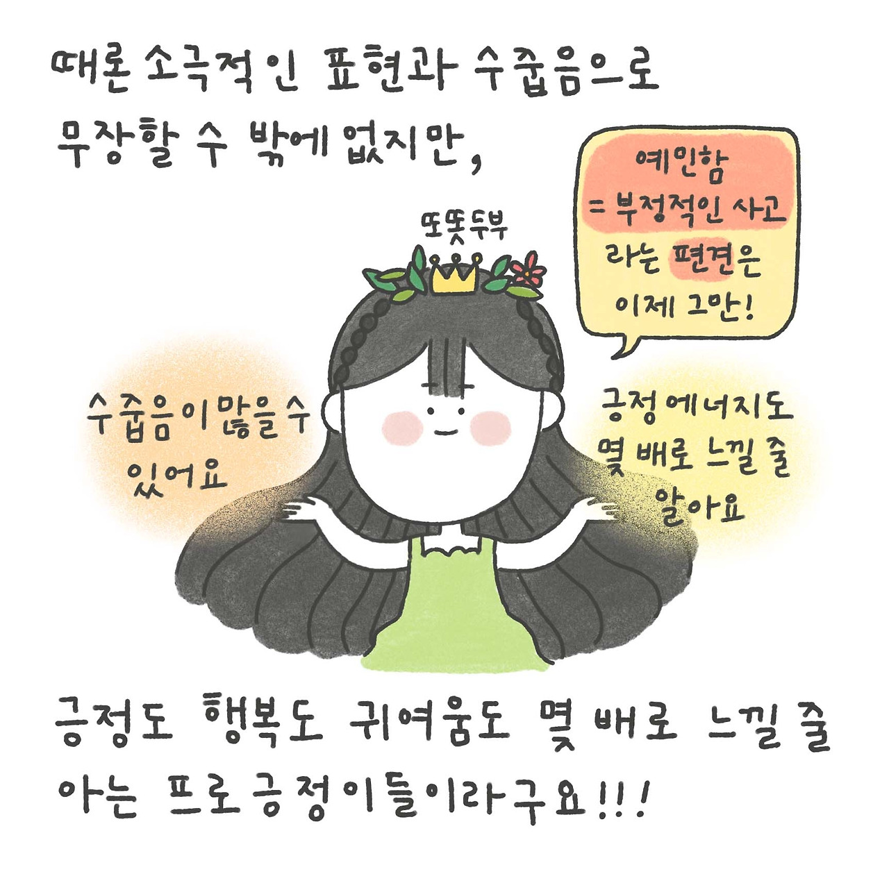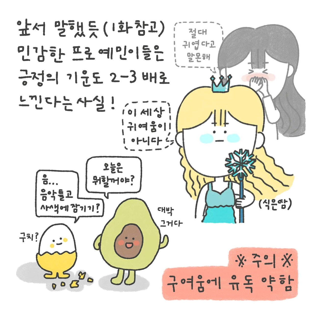물론 타인의 자극에 민감한 만큼 스스로의 행동과 표현이 있어서도 조심스러워지게 될 때가 많은것이 사실이다. 이 때문에 때론 긍정적인 표현이 다소 소극적으로만 비춰질 수 있지만, 알고보면 긍정도 행복도 몇 배로 반응하는 것이 프로예민이들이라는 사실을 잊지 마시길!