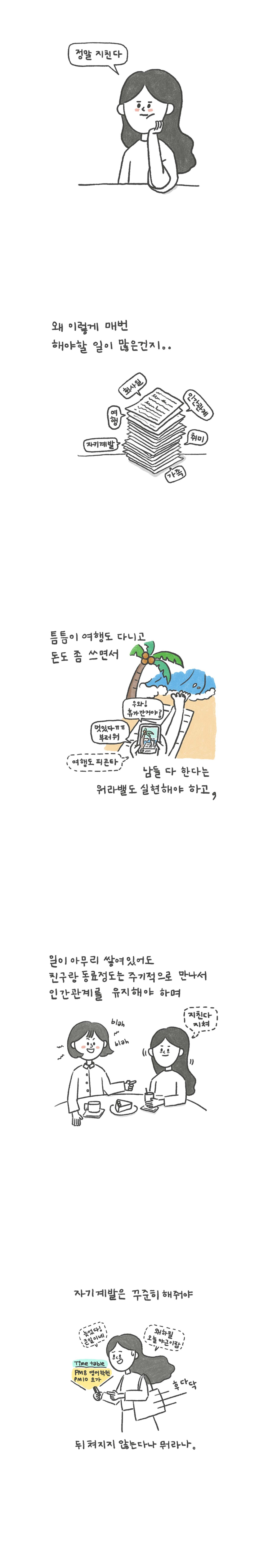 지치지 않는게 이상하리만큼 할 일이 많기 때문입니다. 산더미 처럼 쌓인 내 삶의 문제들만 해도 충분히 벅찬데 틈틈이 여행도 다녀야 하고, 돈도 좀 쓰면서 남들 다 한다는 워라밸도 실현해야 하고, 인간관계 챙기느라 말 한마디 하기 싫은 날에도 꾸역꾸역 몸을 일으켜 모임장소에 나가야 하기 때문입니다.