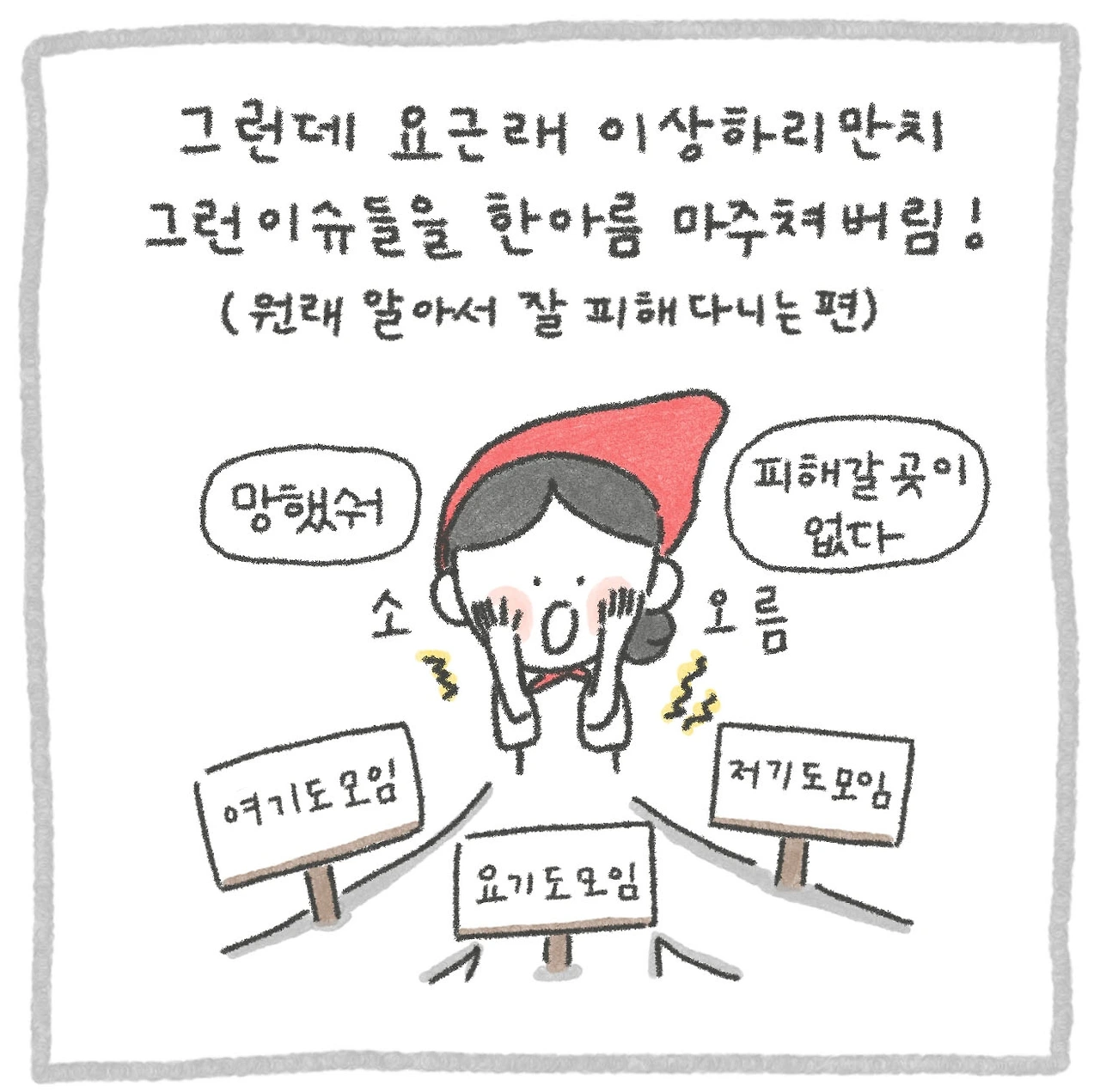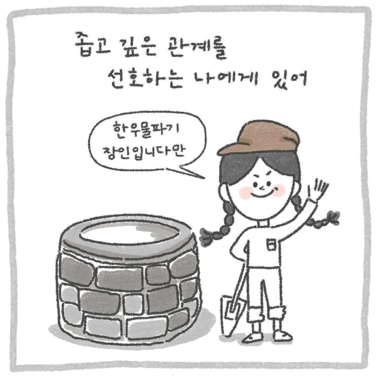 하고 싶은 일만 하면서 살 수는 없는 노릇이지만 스스로가 불행하다고 느끼는 일은 열심히 피해가면서 사는 것이 나를 지켜내는 일이라 생각하며 살아갑니다. 넓고 얕은 곳에서 세상을 두루 체험하는 것 보다는 좁고 깊은 곳에서 잠잠히 한 곳에 머무르는 것을 선호합니다. 이렇듯 한 우물만 파기에도 버거웅 제 자신을 돌아보니 요즘 유행이라는 인싸 타이틀은 준다고 해도 거절해야 할 것 같네요.
