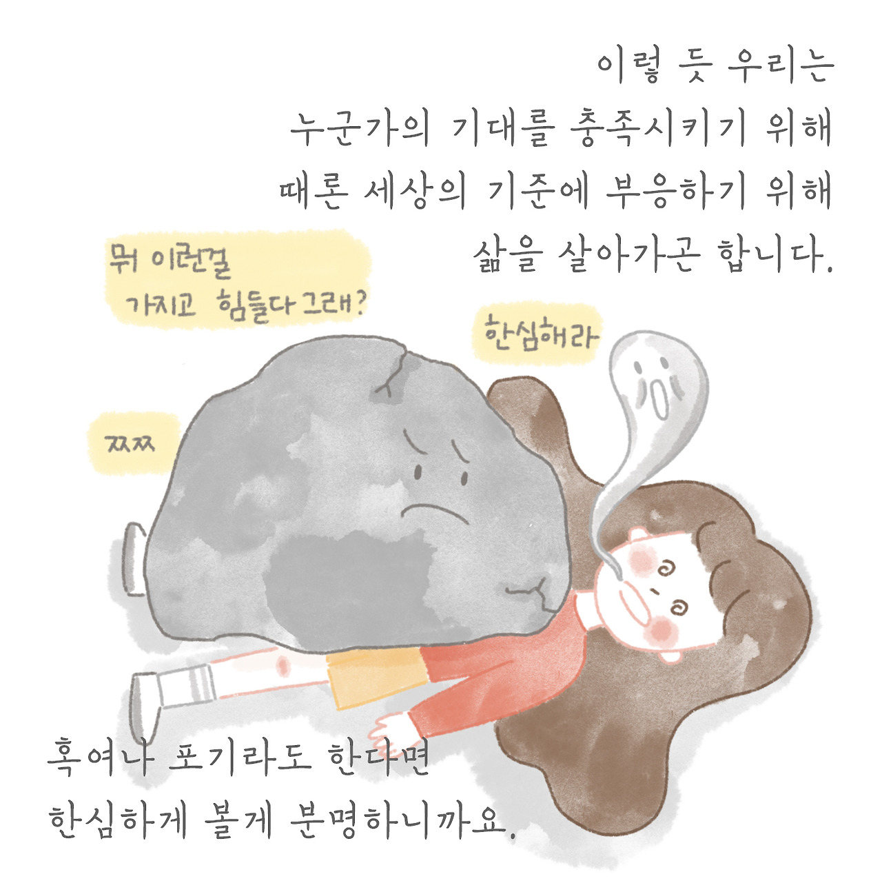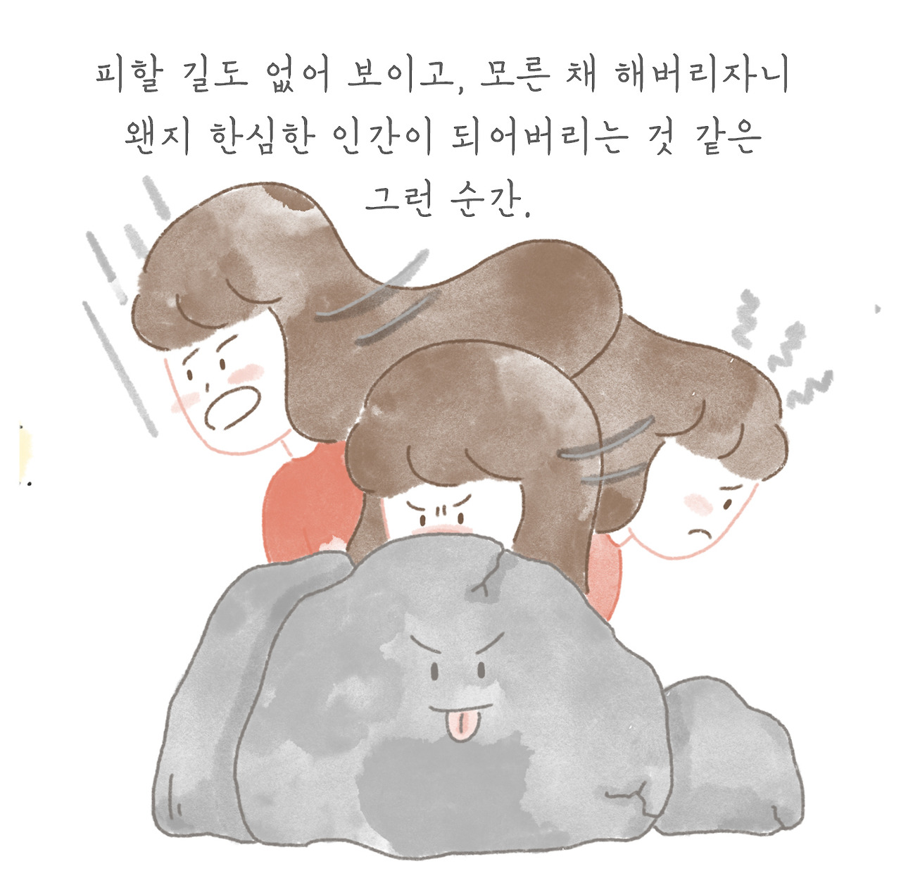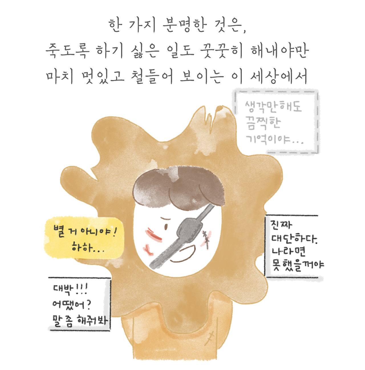 어쩌면 그 순간 ‘이 또한 지나가리라.’ ‘세상에 하고 싶은 일만 하고 사는 사람은 없다.’ ‘모든 것이 나중엔 밑거름이 될 테니 잘 견뎌내면 된다.’ 라는 말로 나 자신을 채찍질 하며 순간을 이겨내는 것도 하나의 방법일 수 있으나 가끔은 ‘이렇게나 하기 싫은데 굳이 해야 하는 걸까?’ 라는 의문이 들 때도 있기 마련입니다. (심지어 그 일을 해냈다고 해서 딱히 보람차거나 대견 하지도 않습니다. 미래에도 그저 끔찍한 일로 회상 될 뿐이지요.)