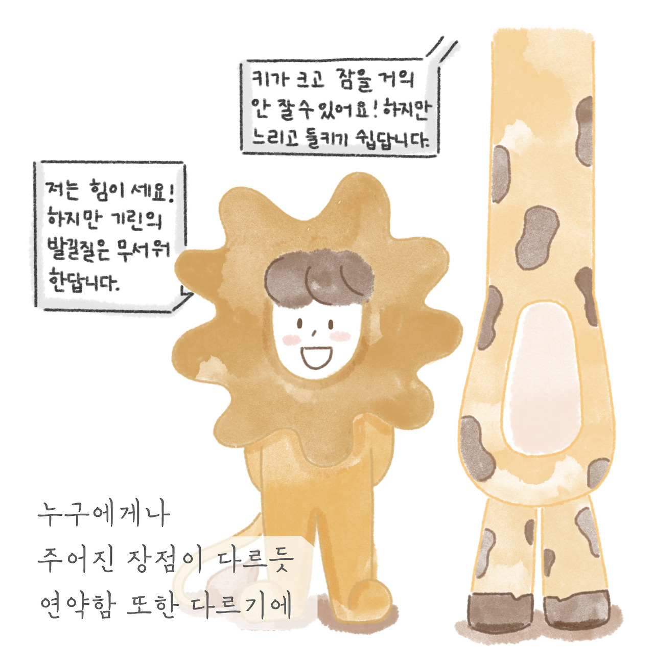 이렇 듯 우리는 누군가의 기대를 충족시키기 위해 때론 세상이 정해놓은 가치와 기준에 부응하기 위해 삶을 살아가곤 합니다. 다른 사람도 다 했으니 나도 해내야만 한다는 엄격한 기준을 세우고선 말이죠. 하지만 누구에게나 주어진 장점과 재능이 다르듯 약점과 연약함 또한 다릅니다. 그렇기에 죽기 살기로 피하고 싶은 일은 내가 나약해서가 아니라 그저 나에게 있어 연약한 부분일 뿐입니다.