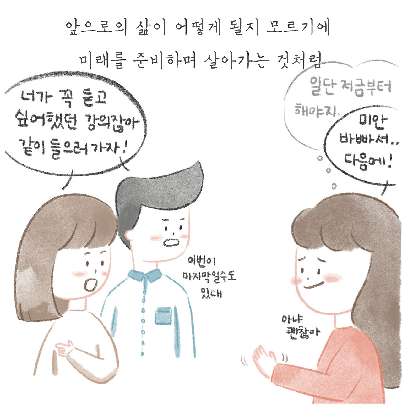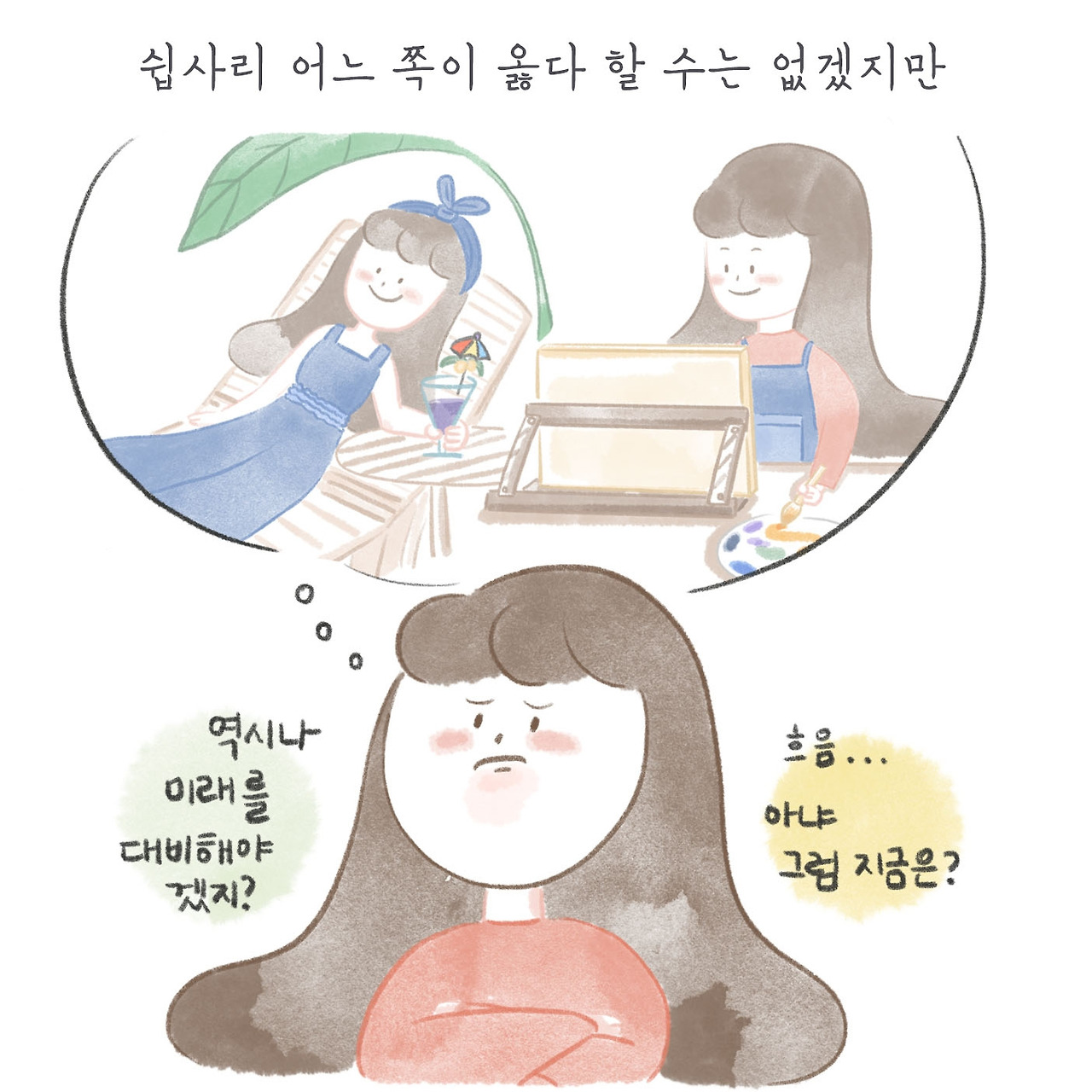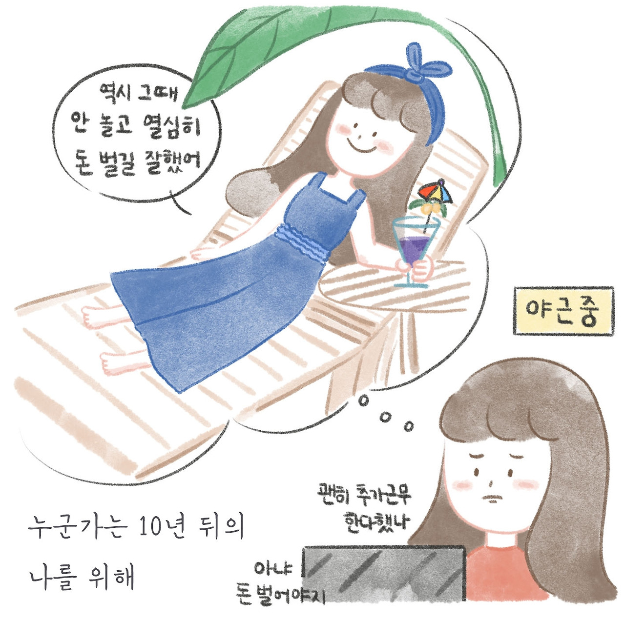 그렇다고 한번 사는 인생 내 멋대로 살아보자는 이야기는 아니다. 다만 미래의 나를 열심히 돌보다가 현재의 나를 돌보지 못하는 일만 없기를 바랄 뿐.