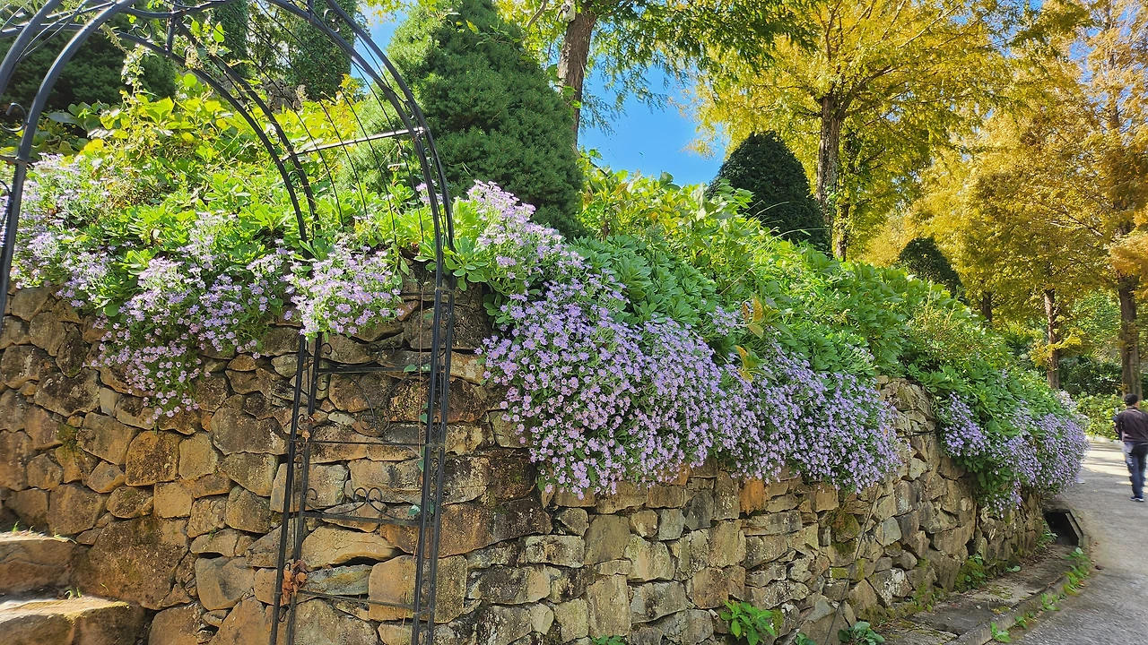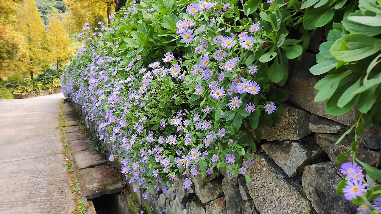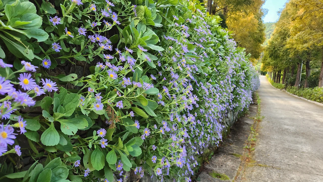 해국 무리가 덮은 돌담 사이로 완연한 가을이 고개를 내밀었습니다. 청명한 가을 하늘에 신호라도 보내듯 부는 바람에 쉼 없이 손을 흔들었습니다