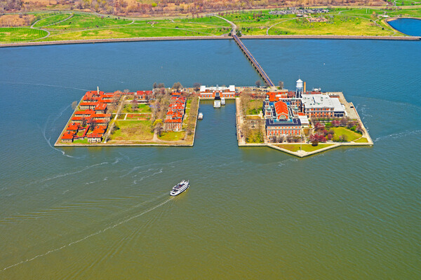 자유의 여신상이 지켜보는 시선 아래 위치한 엘리스 아일랜드는 뉴욕 시 가까이에 있는 작은 섬으로, 1892~1934년 사이에 미국 이민자들의 입국 수속을 받던 곳이다. 따라서 흔히 '신세계로 통하는 관문'이라 비유되었으며, 현재는 1900년에 재건축된 건물들이 대중에게 개방되어 있다.