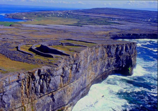 아일랜드 애런 섬의 최대 관광지, 던 앵거스(Dun Aengus)는 선사 시대에 만들어진 요새로도 유명하다. 이곳에서는 신기하게 칼로 자른 듯 반듯하게 위아래로 깎아진 절벽을 볼 수 있다. 마치 대륙의 끝에 온 느낌을 자아내는 이 곳에서 아래를 내려다보면 세차게 소용돌이 치고 있는 바다를 볼 수 있는데, 대자연 앞에 절로 무릎이 꿇린다고.