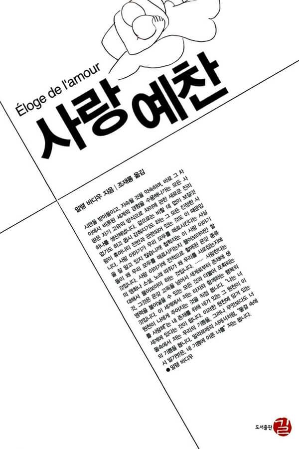 세계적인 철학자의 사랑에 관한 심도 있는 에세이, <사랑예찬>은 진정한 사랑이 실종된 우리 시대의 사랑에 대하여 이야기하는 작품이다. 그는 남녀 간의 사랑이란 진리를 생산하는 절차이며, '사랑한다는 것'은 온갖 고독을 넘어 세계로부터 존재에 생명력을 불어넣을 수 있는 모든 것과 더불어 포획되는 것이라 이야기한다.