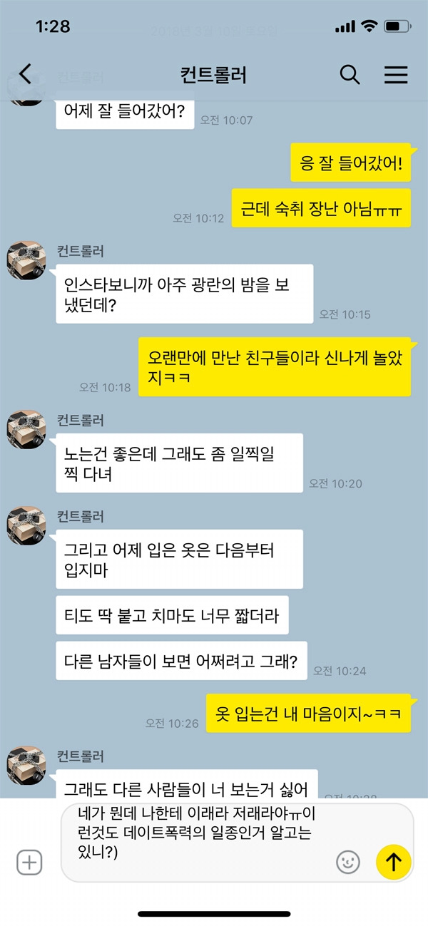 연인 사이에서도 상대방의 행동을 통제하는 것은 데이트 폭력의 일종이라고 간주된다. 하물며 연인도 아닌 사람이 내 행동이나 옷차림, 말투를 지적질 한다면? 당연 어이가 없다. 이 사람과의 만남을 계속 이어나가야 하는 건지 심각하게 고민하기도 한다. 아직 연인도 아닌데 벌써부터 이런 행동과 말을 보이는 것은 굳이 겪어보지 않아도 이미 예상할 수 있는 레퍼토리가 정해져 있기 때문이다.