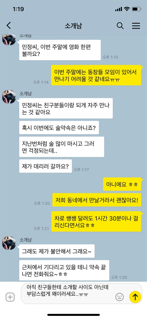 일부러 연락을 씹은 것도 아니고 사정이 있어서 카톡을 늦게 확인하거나 답변이 늦어진 것인데 짧은 시간에 카톡 폭탄을 날리는 썸남, 왠지 관심과 걱정이라고 하기에는 조금 집착하는 유형으로 느껴진다. 빠른 답변을 하면 좋겠지만 상황이라는 것이 있기 마련인데 그런 상황은 이런 유형에게 이유로 통하지 않는다. 재깍재깍 반응하지 않으면 폭발할 것 같은 그 남자, 사귀기 전에도 이런데 만약 남자친구가 된다면? 상상만 해도 아찔하다.