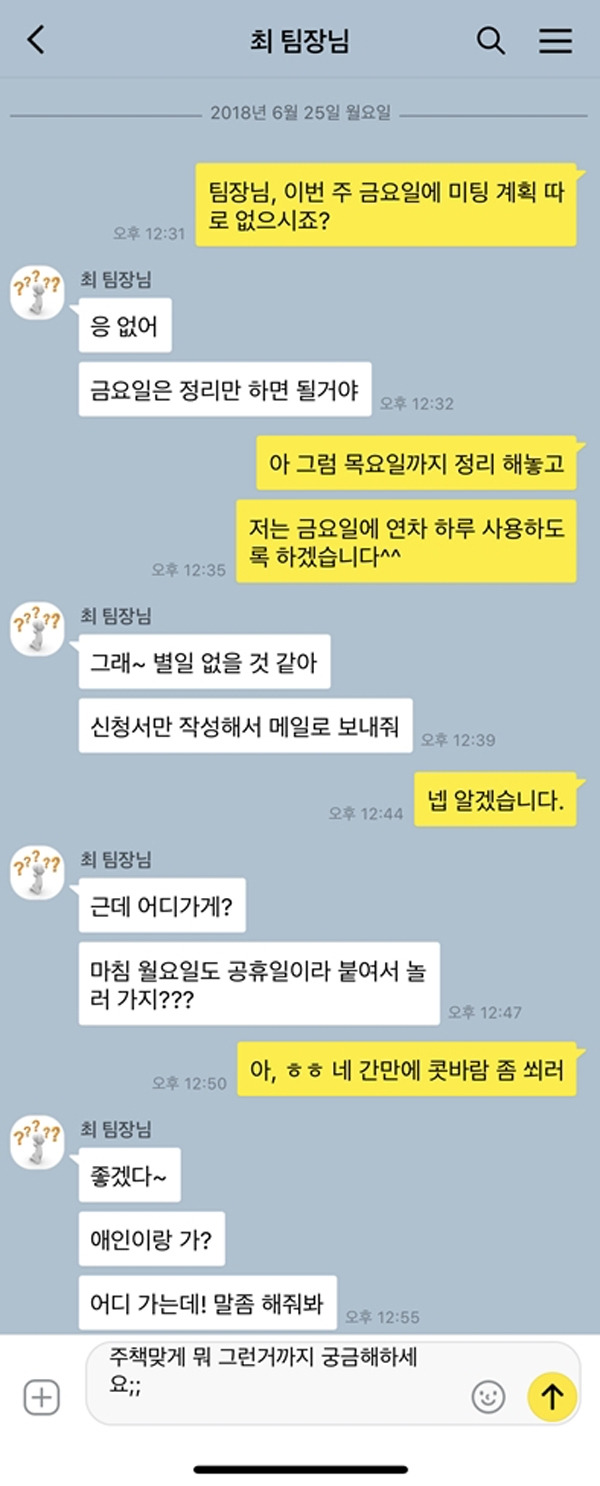 주중에 연차를 쓸 때는 크게 물어보지 않다가도 주말을 앞둔 금요일이나 샌드위치 연휴가 껴 있어 연차를 쓸 때 꼭 어디 가냐고 물어보는 상사들도 있다. 놀러 가는 것이냐, 친구랑 가냐, 애인이랑 가냐, 언제 오냐, 등 결재 칸에 사인을 하고 난 후에도 집요하게 캐묻는다. 30초면 충분히 결재를 득할 법도 한데 이런 상사한테 결재를 받으려면 족히 5분은 질문 공세를 받아야 한다. 도대체 왜 내가 언제 연차를 쓰는지, 왜 쓰는지, 누구랑 놀러 가는지, 그런 게 궁금한 걸까?