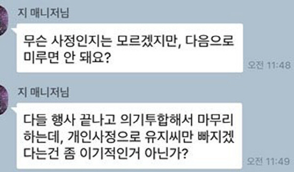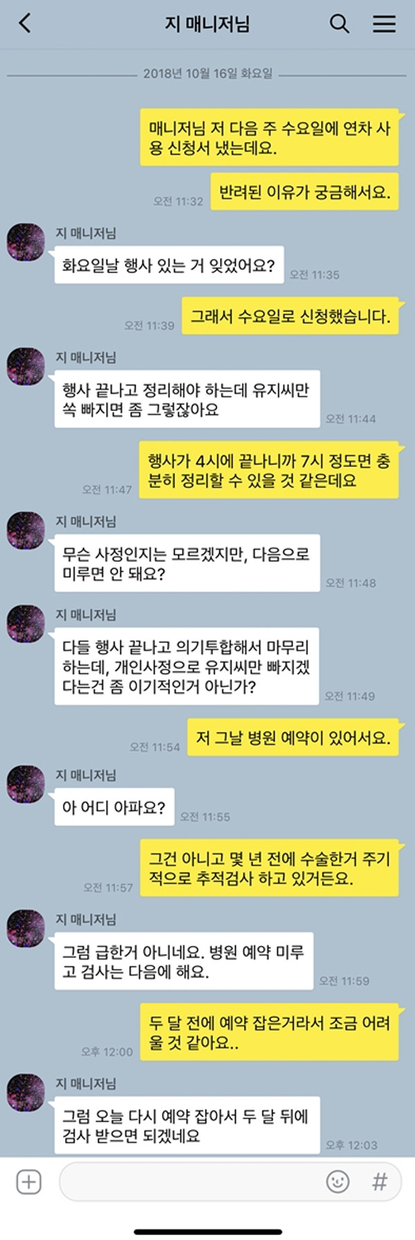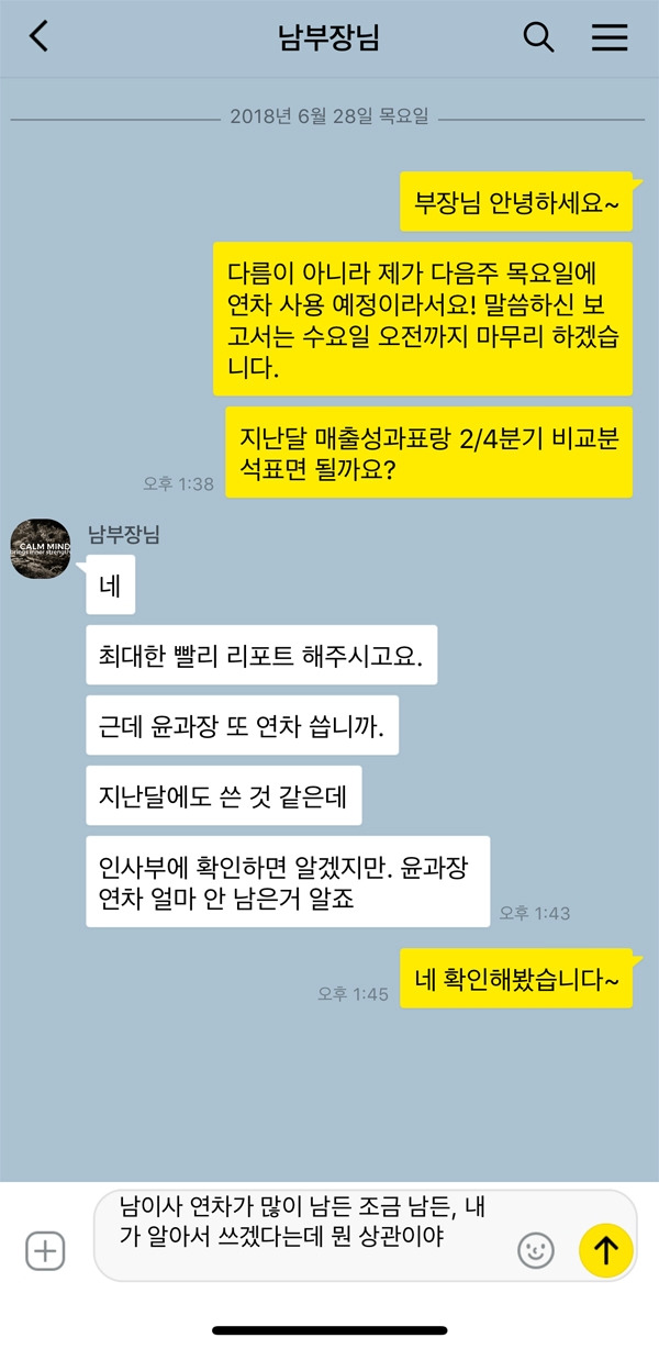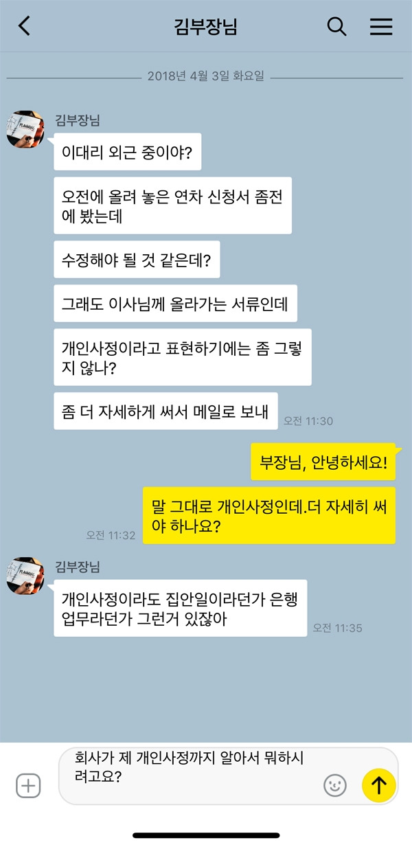 개인적인 일이라고 해서 회사의 일보다 중요하지 않다고 판단해버리는 직장 상사는 정말 최악 중 최악이다. 연차를 쓸 때 회사의 사정을 고려해 최대한 지장을 주지 않으려고 하는 것이 직장인들의 기본 태도, 그런데 그렇게 고려해서 기안을 올렸는데 깡그리 무시하면서 나의 연차 사용 날짜까지 지정해주는 건 도대체 어떤 상식에서 비롯된 것일까? 만약 상사라 하더라도 공손하게 부탁했다면, 그리고 특별한 일이 아니었다면 바꿀 용의도 충분히 있었을 것이다. 하지만 저런 태도로 일관하는 사람에게는 한 치도 양보하고 싶지 않다.