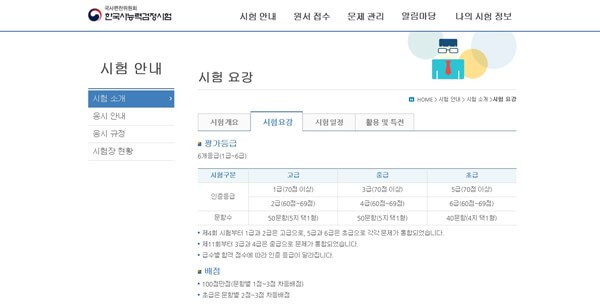 한국사능력시험은 주로 공공기관과 임용고시를 목표로 하는 사람들을 위한 자격시험이다. 대다수 공공기관에서 채용 시 가산점을 부여하는 자격증으로, 취업 스펙으로도 쓰임새가 있는 자격증이다. 다만 1급부터 6급까지 나누어져 있어 상위 등급인 1~3등급 이상이어야만 취업에 있어 효용성이 있다. 4~6급의 경우에는 취업에 있어 효용성이 전무한 편이기 때문에, 1~3주 정도를 투자해서 높은 등급을 따 두는 것이 유리하다.