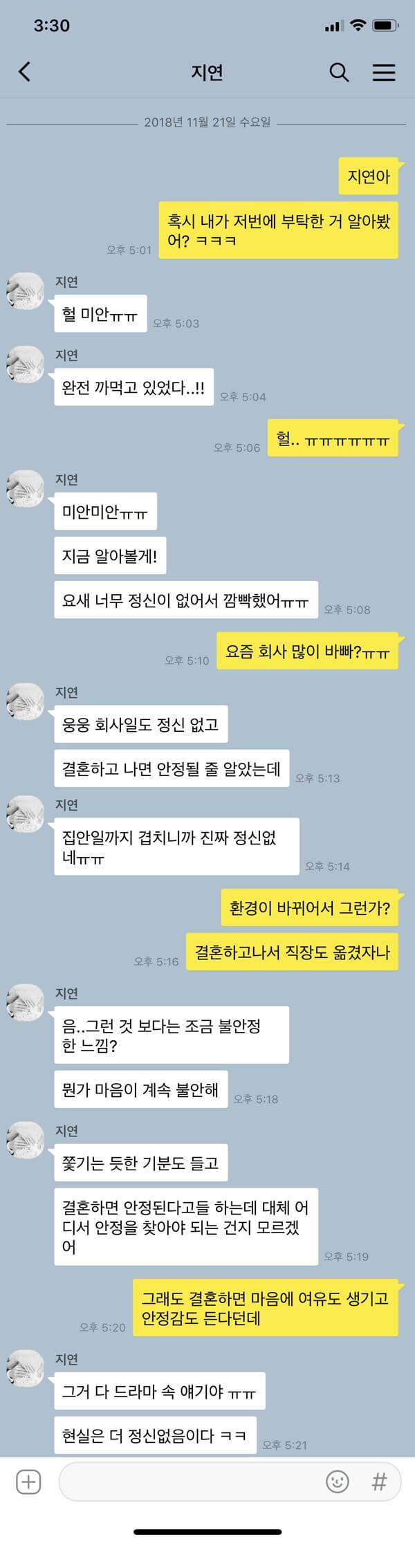 진로를 결정하고 직장을 갖게 되고 어느 정도의 커리어를 쌓은 후 30대가 되면 내 분야에서는 나름의 전문성을 가진 사람이 되어 있을 줄 알았다. 직장도 소득도 안정되다 보면 삶 자체도 많이 안정적일 줄 알았다. 하지만 10대 방황하던 시절보다 더 방황하는 것이 30대였으며 내가 가는 길이 맞는 것인지 고민의 늪에 빠져 있다. 결혼은 내 삶을 새롭게 정립하는 계기가 될 것이라고 생각했지만 드라마 속에나 존재하는 이야기 같았다. 마음의 안정, 경제적인 안정, 도대체 언제가 돼야 찾아올까?