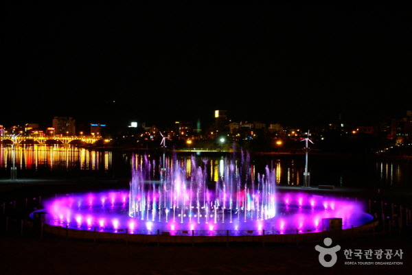 진주성 외곽, 남강 둔치에 설치된 음악분수대는 진주의 명물 중 하나다. 이미 전국 곳곳에서 음악 분수대를 쉽게 볼 수 있지만 이곳이 더욱 특별한 이유는 음악에 맞춰 분수 모양과 조명 및 효과들을 직접 수동으로 연출했기 때문이다. 특히 낮 시간이 아니라 어둠이 내린 저녁 시간에만 운영되다 보니 화려한 조명과 음악이 진주의 밤을 더욱 아름답게 수놓는 듯하다. 다만 음악 분수대는 일 년 내내 운영되는 것이 아니기 때문에 사전에 운영시간을 미리 알아보고 가는 것이 좋다.