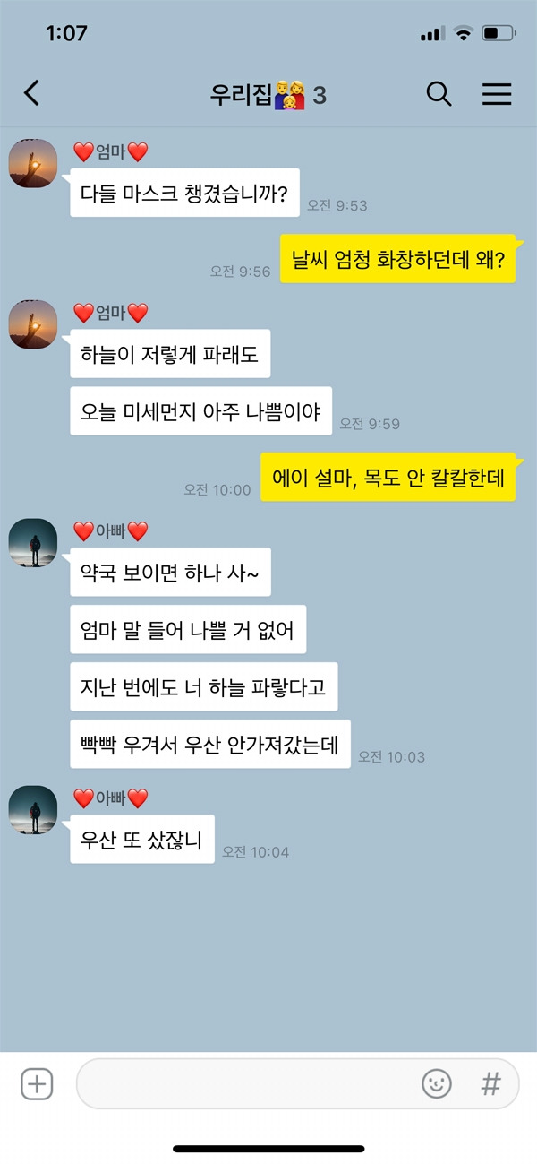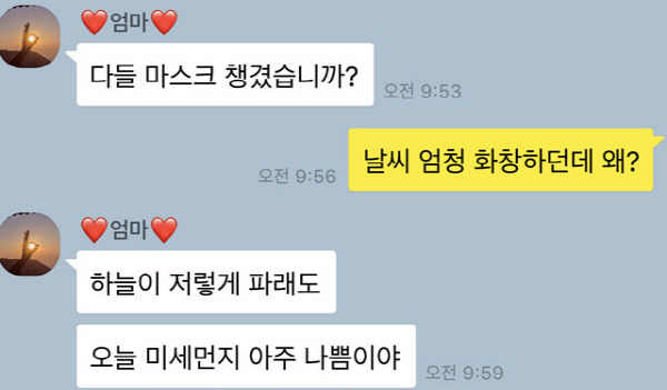 매일 아침 날씨 예보를 해주는 사람, 이제는 미세먼지와 초미세먼지 농도까지 검색해 대기 질까지 카톡으로 알려준다. 대게 가족 채팅창에서 엄마들이 많이 하는 편이다. 사랑하는 가족들이 혹시 갑자기 비를 맞지는 않을까, 공기가 나쁜데 마스크라도 잊지 않았을까, 날씨가 제법 쌀쌀한데 옷은 따뜻하게 입었을까 하는 염려와 걱정의 마음에서 늘 자고 기상 캐스터를 자처한다. 그러니 잔소리라고 생각하지 말고 가족을 위한 따뜻한 배려의 말이라고 생각하자.