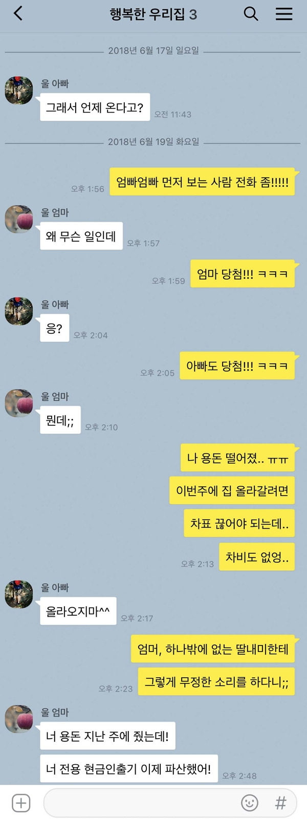 가끔은 말보다 글로 마음을 전할 때 진심이 더 느껴질 때가 있다. 하기 힘든 말도 말보다 글로 전하면 한결 쉬워진다. 돈이 필요할 때도 예외는 아니다. 부모님에게 아쉬운 소리를 해야 할 때, 간곡한 부탁을 할 때 전화보다 카톡으로 먼저 전하면 얼굴 정면 혹은 수화기 너머로 쏟아지는 잔소리 폭탄으로부터도 약간 비껴 나 있을 수 있다. 그런데 부모님 입장에서는 돈 필요할 때만 카톡 하는 자녀는 얄밉기 마련, 그러니 돈 필요할 때만 카톡 하지 말고 평소에도 살갑게 자주 대화를 해보는 것은 어떨까?