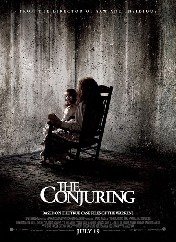 쏘우와 인시디어스를 잇따라 흥행시킨 제임스 완 감독이 만든 영화로 포스터에서는 ‘무서운 장면 없이 무서운 영화’라고 표현했다. 그도 그럴 것이 쏘우에서 보여주었던 끔찍한 고문 장면도 없었고 잔인한 비주얼이나 악령의 존재도 잘 드러나지 않았다. 촬영 기법과 연출을 통해 오로지 심리적 공포만을 이용한다. 실존 인물인 로레인 워렌과 에드 워렌 부부는 심령 현상을 조사하는 단체를 만들어 1만여 건의 심령 현상을 조사하고 해결했는데 그중 하나였던 페론 가족 사건의 실화를 영화화한 것이 컨저링이다. 1편과 2편 연이은 대박 흥행으로 컨저링 유니버스가 탄생하게 됐다.