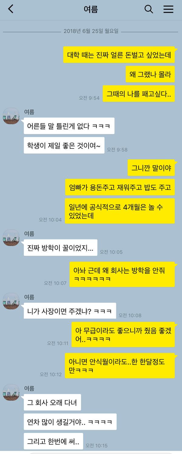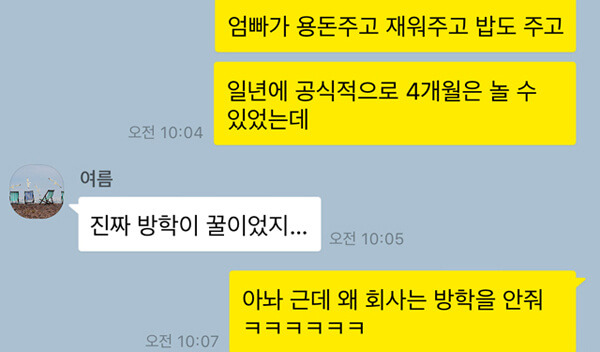 재충전의 시간이 필요한 직장인들에게 여름휴가는 너무 짧기만 하다. 연차를 다 붙여 쓰는 것은 눈치가 보일뿐더러 혹시 모를 상황에 대해 어느 정도는 남겨둬야 한다. 이럴 때 직장인들은 학생 시절이 사무치게 그립다. 아무것도 하지 않고 빈둥빈둥할 수 있는 꿀 같은 시간, 그때는 방학 끝자락으로 갈수록 지루하고 그랬는데 지금 생각해보면 그 시간을 정말 알차게 쓸 수 있을 것 같다. 일 년에 두 번씩이나 있던 방학, 두 번까지는 바라지도 않고 두 달을 다 주지 않아도 괜찮으니 정말 직장인을 위한 방학이 딱 한 달만 있었으면 좋겠다.