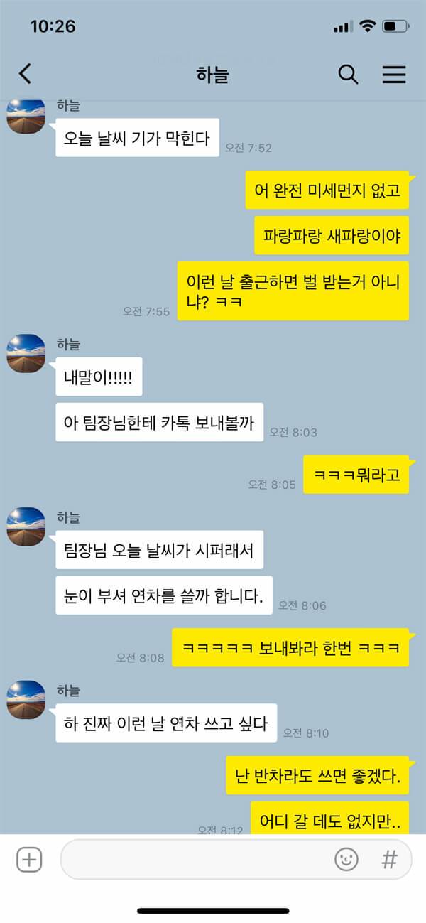 지난밤 술을 과하게 마셔서 다음 날 지구가 평소보다 500배는 빠르게 도는 것 같을 때, 겨우 일어나 시계를 봤는데 내 눈이 의심스러울 때, 출근하려고 딱 나왔는데 기분 좋은 바람이 나를 싹 스며 지나가고 따뜻한 햇살이 부드럽게 온몸을 내리쬘 때, 이럴 때 순간 드는 생각은 ‘아 오늘은 출근 따위 패스하고 싶다, 연차 쓸까?’. 대부분의 회사에서는 연차 사용을 미리 계획하고 사용하며 급한 일에만 연차를 당일로 사용하는 분위기라 말 꺼내기도 쉽지 않지만 그래도 늘 마음속으로는 힘차게 연차 사용을 외치고 있다.