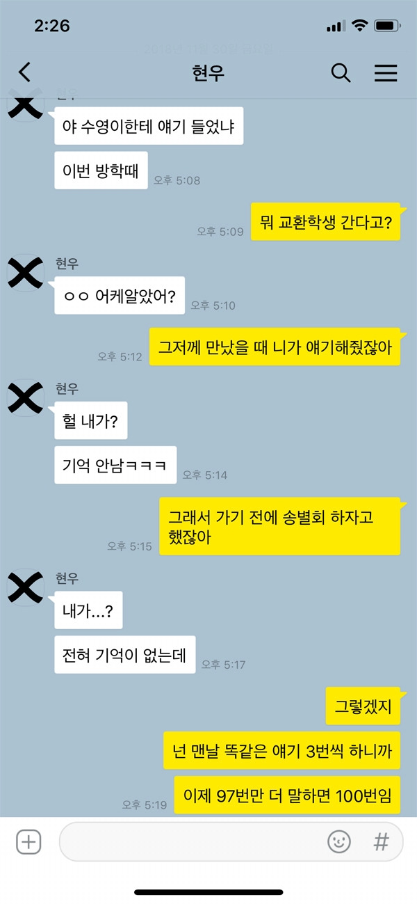 했던 얘기를 하고 또 하고, 이 정도면 왠지 같은 말 반복증에 걸린 사람 같다. 물론 일부러 그 얘기를 반복해서 하려고 하는 것보다는 했는지 안 했는지 정말 생각이 안 나기 때문이다. 대화를 이어가다 보면 전에 얘기했었다는 것이 문득 들 때가 있는데 상대방은 그냥 조용히 듣고 있는 반응, 혹은 본격적인 이야기가 시작되기도 전에 칼같이 자르면서 ‘지난번에 얘기했었잖아’라는 반응을 나타낼 수 있다. 조용히 듣고 있다면 그 사람 역시 기억력이 좋지 않은 사람이거나 배려가 깊은 사람이고 칼같이 자르는 사람이라면 당신의 그런 기억력을 더 이상 참기 힘들 정도로 많이 겪어본 사람일 확률이 크다.