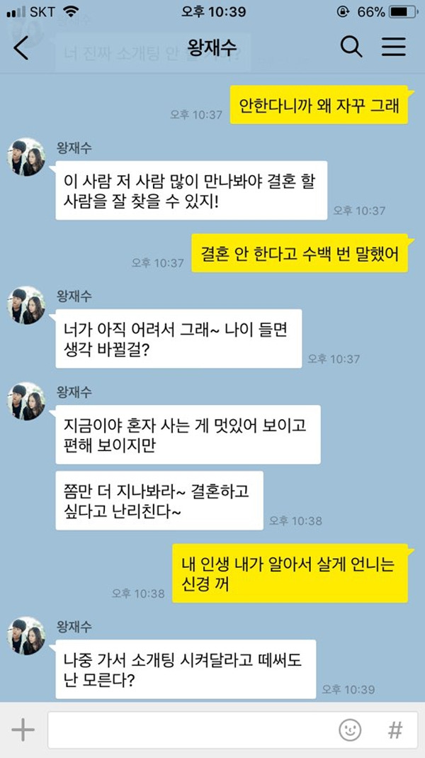 언제부터 그렇게 비혼주의자들에게 관심이 많으셨어요? 라고 반문하고 싶게 만드는 유형이다. 비혼이라는 가치관을 가볍게 여기며, 결국 비혼의 끝은 결혼임을 이야기한다. 도대체 결혼을 안 하겠다는 건 난데, 뭐 이리 내 인생이 관심이 많은 건지! 남의 이야기를 빌려 은글슬쩍 비혼을 까 내리는 듯한 태도가 상당히 불쾌함을 주는 유형이라고 할 수 있다.