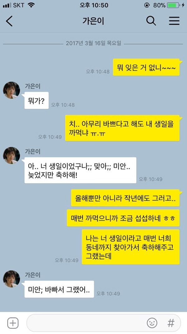 기쁜 일을 함께 기뻐해 주는 것보다 슬픈 일을 함께 슬퍼할 수 있는 친구가 진짜 좋은 친구라는 말이 있다. 같은 맥락에서 내가 힘든 상황에 처했을 때 보이는 친구들의 행동을 보면 어떤 친구가 좋은 친구인지 한눈에 보이기도 한다. 징징대며 하소연을 하는 게 아니라 정말 마음 둘 곳이 없어 기대고 싶을 뿐인데 왠지 모르게 의지가 안 가는 그런 관계들. 겉만 번지르르했지 속은 텅 비어 있는 허울뿐인 사이임이 분명하다.