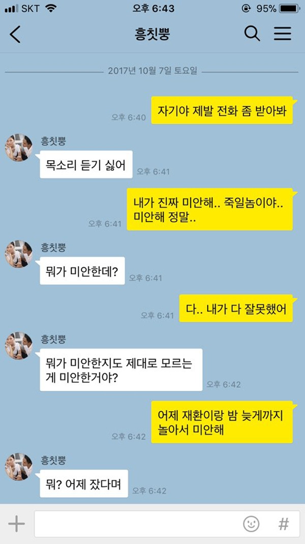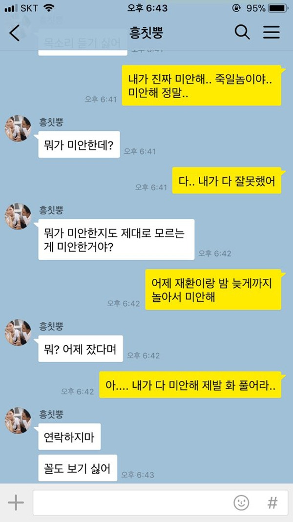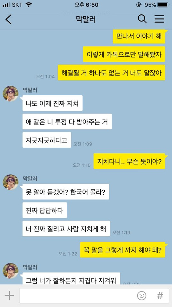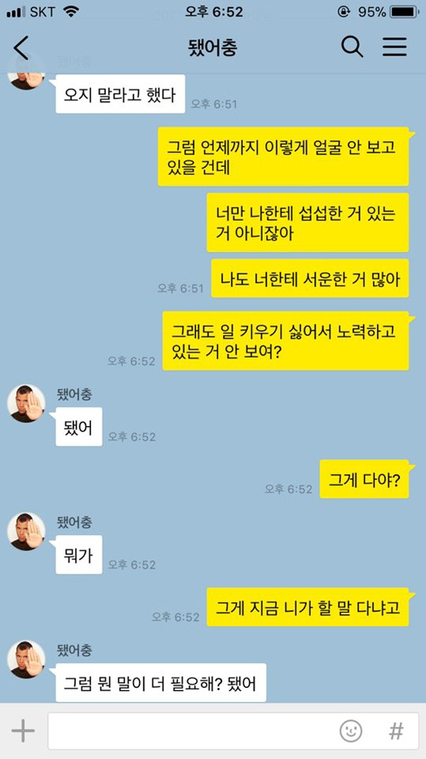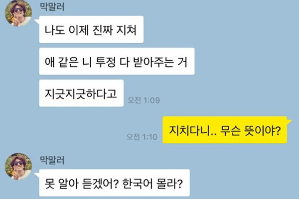 연인 사이의 싸움은 다양한 형태로 나타나지만 그 중 카톡에서의 싸움은 특히 더 불꽃이 튀는 심리전이라고 할 수 있다. 얼굴을 보지 않은 채 텍스트로만 다투는 것이기 때문에 상대방의 표정이나 심리를 명확하게 읽을 수 없기 때문. 이 때 종종 등장하는 명대사들이 있는데, 이 명대사들은 싸울 의지마저 바닥으로 떨어트리는 어마어마한 비호감수치를 가졌다. 있던 정 없던 정 다 떨어지게 만드는 연인들의 한 마디를 모아 보았다.