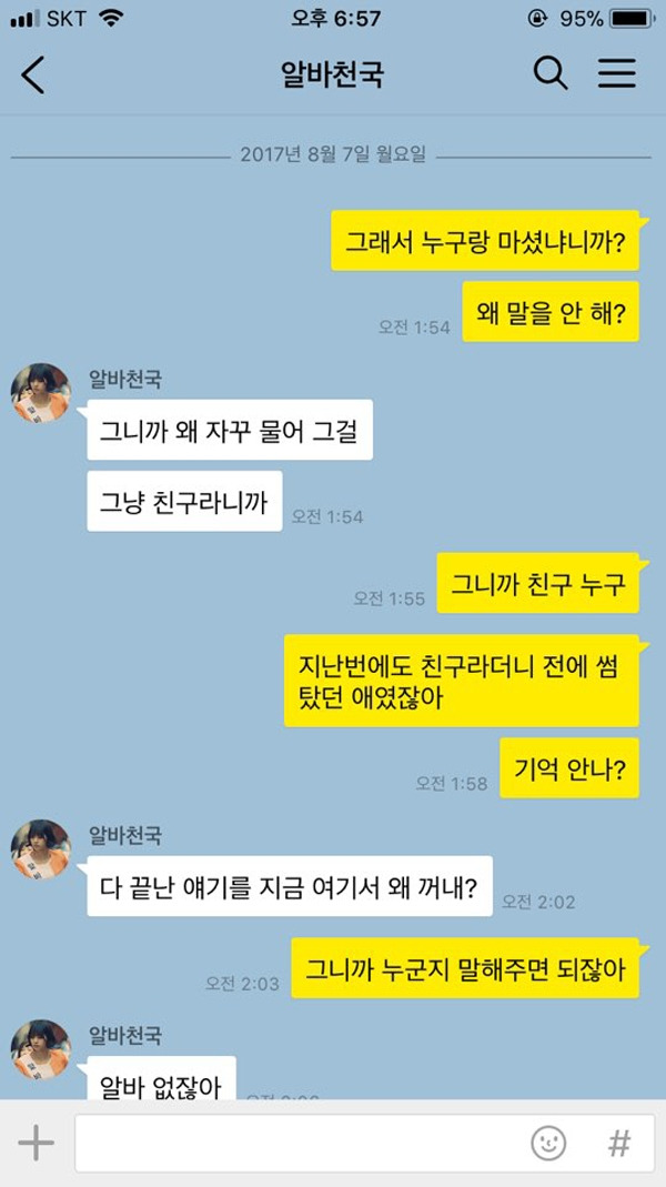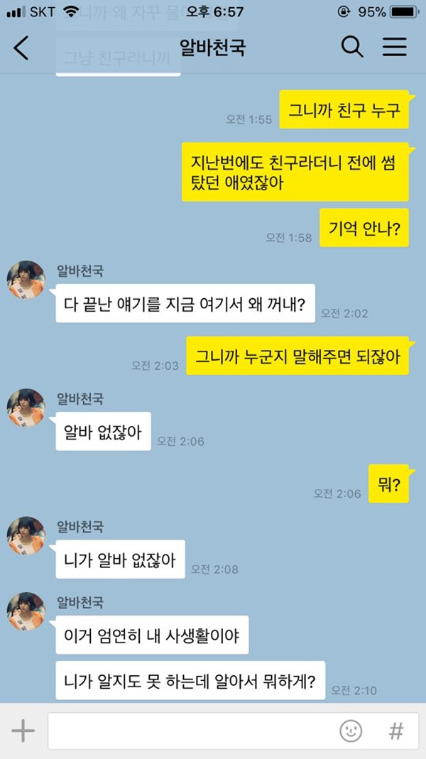 제가 그 쪽 애인 맞아요? 저 사랑하는 거 맞아요? 라고 반문하고 싶은 한 마디이다. 물론 연인 사이의 적정선의 사생활은 보장되어야 하는 게 맞지만 아무리 그렇다고 해서 이렇게까지 차갑고 날카롭게 말 할 필요가 있는 것일까? 마치 남인 양 이야기하는 애인을 보고 있자면 정과 함께 눈물이 뚝뚝 떨어질지도 모른다. 이제는 다툼의 원인에서 벗어나 이런 말을 했다는 것 자체로 또 다른 다툼을 불러일으킬지도 모르는 유형이다.
