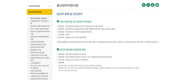 보건소에서 임신 초기 검사부터 임산부와 태아에 필요한 영양제를 무료로 제공한다. 또한 임신초기 기본혈액검사, B형 간염, 에이즈, 풍진, 매독, 소변검사 등을 받을 수 있다. 보건소에 등록된 임산부는 건강에 필요한 철분제와 검사를 임신 16주에서 출산 전까지 받을 수 있다고 하니 필히 보건소에 등록하여 정부의 혜택을 받아 산모와 아기 모두 건강할 수 있도록 한다.