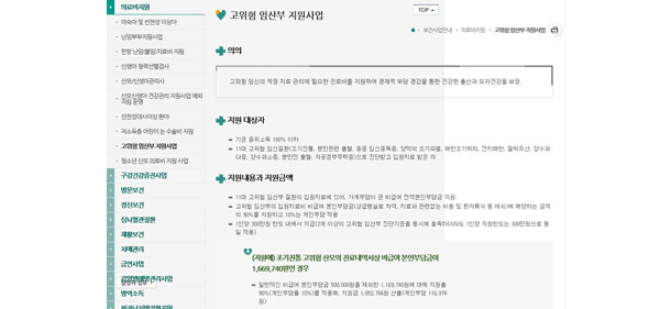‘고위험 산모 비급여 입원 진료비 지원’ 정책은 5대 고위험 임신질환을 진단받고 입원한 임산부의 입원치료를 지원한다. 5대 고위험 임신질환에는 조기진통, 분만관련출혈, 중증임신중독증, 양막 조기파열, 태반 조기박리 등이 있다. 이러한 고위험 임신의 치료와 관리에 필요한 진료비를 지원하여 임산부가정의 경제적 부담을 덜고 건강한 출산을 돕는 지원사업이다.