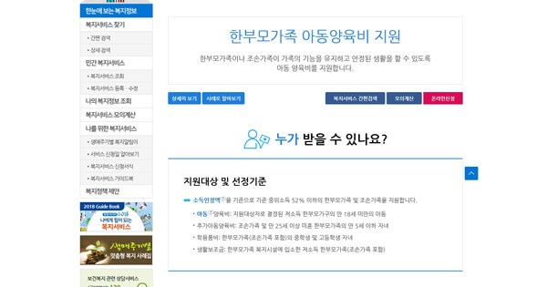 ‘저소득 한부모가족 양육비 지원’ 정책은 기준 중위소득 52% 이하의 저소득 한부모가족의 아동 양육비를 지원한다. 18세 미만 자녀까지 월 20만원을 지원하고 만 24세 이하 청소년 한부모의 경우에는 자녀 양육비로 35만원을 지급한다. 미혼모나 한부모가족의 양육부담을 경감하고, 자립할 수 있도록 도와주는 정책이다. 한부모가족 복지시설에는 아이돌보미를 무상으로 파견해주기도 한다.