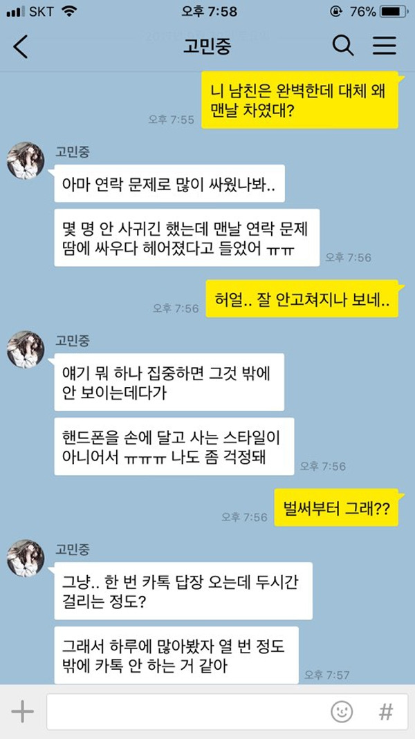 물론 바람을 피운 전여친의 문제가 가장 크지만 만약 그 바람의 원인이 남친이었다면? ‘연애를 하고 있지만 연애를 하지 않을 때보다 더 외롭다’라는 말이 있다. 분명 착하고 좋은 사람이지만 왠지 곁에 있으면 있을수록 나의 외로움만 커지는 그런 사람. 결국 전여친도 남친의 곁에서 외로워하다 바람을 피우게 되었다면 어딘지 모르는 찝찝함이 몰려온다. 그냥 전여친 자체가 나쁜 사람이어서 바람을 피웠을 수도 있지만 혹시라도 남친과의 문제에서 비롯된 바람이라면 한 번쯤 다시 생각해보는 것도 나쁘지 않다. 괜히 심란해지는 마음은 잘못된 것이 아니다.