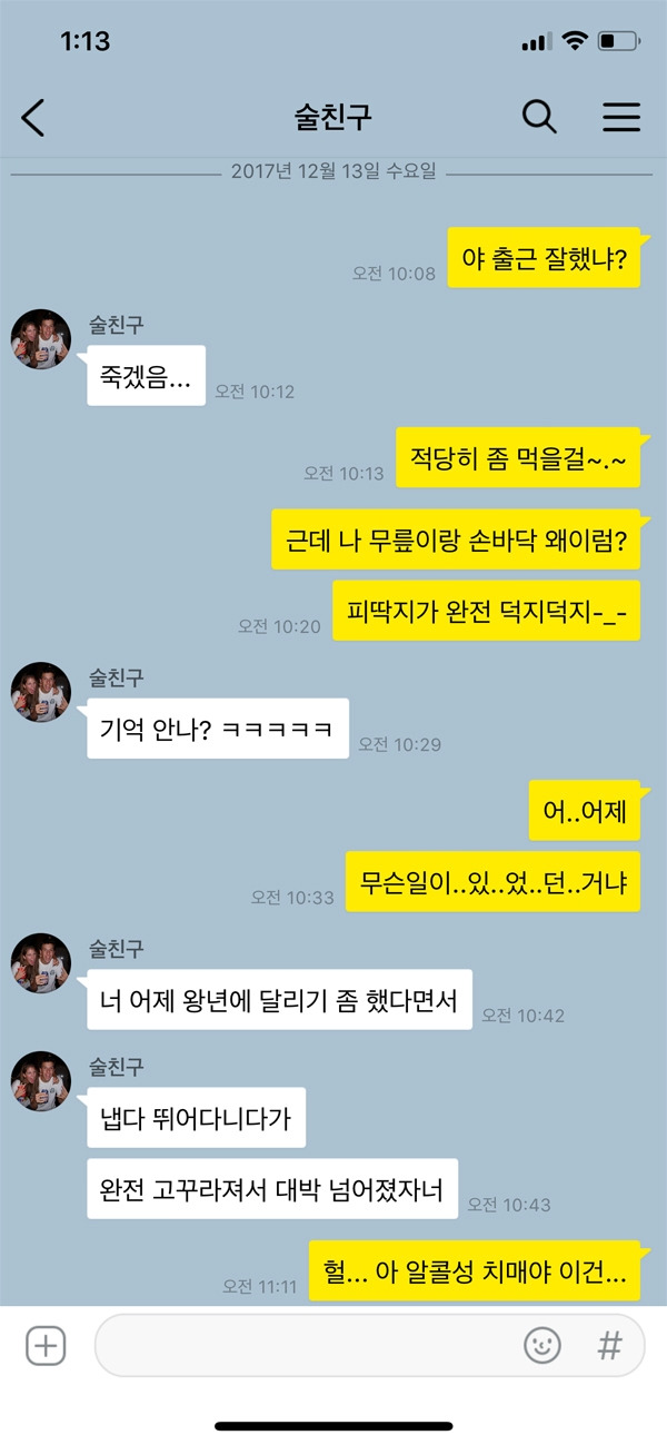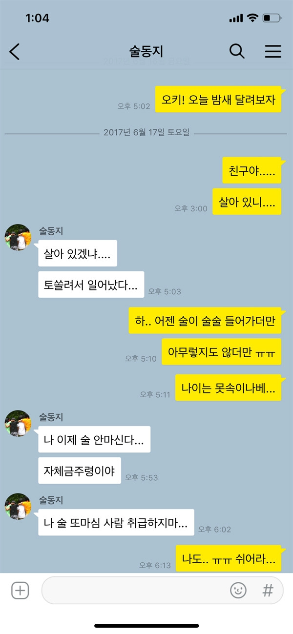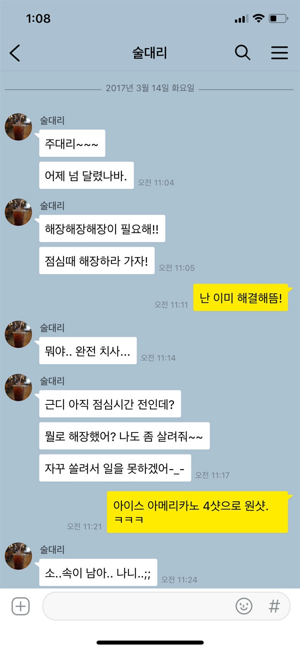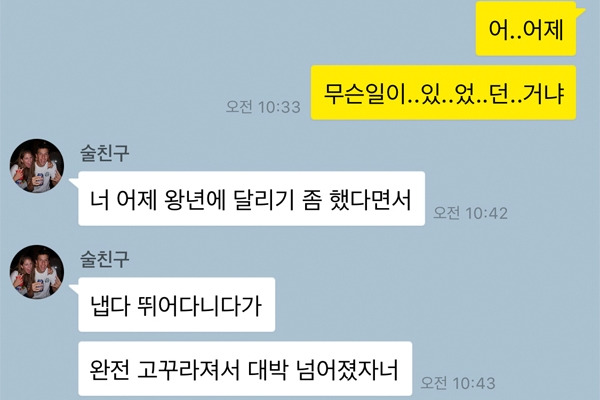 어제는 분명 너무나 즐겁게 신나는 기분으로 술을 들이부었는데 다음 날 남은 건 퀭한 얼굴과 불쾌한 숙취뿐이다. 종일 숙취에 시달려 고생하면서 두 번 다시 술은 입에 대지도 않겠다며 다짐하고 또 그 와중에 살아야겠다며 숙취를 해결할 방법을 찾아 헤맨다. 지겹도록 똑같은 레퍼토리가 계속되지만 그럼에도 불구하고 이번 주말도 술 약속을 잡는 당신이라면 아래 대화 내용들이 200% 공감될 것이다.