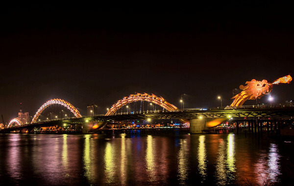 용교라고도 부르는 다낭의 랜드마크, 용다리는 밤이면 화려한 LED 조명으로 더욱 화려하게 빛난다. 용의 몸을 형상화한 다리 모양으로 2013년 3월 세워졌다. 주말 저녁 9시에는 10분간 용의 머리에서 불을 뿜어내는 퍼포먼스가 펼쳐진다. 걸어서 다리를 건널 수도 있고, 용교 머리 쪽에 있는 사랑의 부두를 함께 둘러보기에도 좋다.