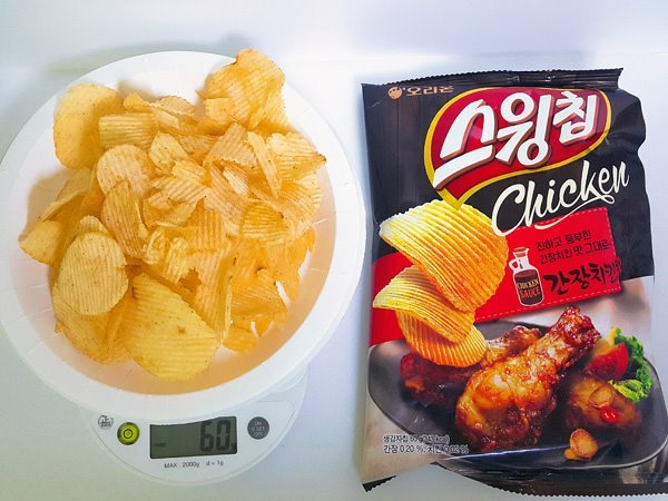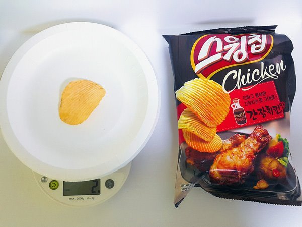 실제로 잰 ‘스윙칩 간장치킨맛’ 1개 중량은 2g, 전체 중량은 60g으로, 기재된 중량과 차이가 없었다. 표면은 울퉁불퉁 굴곡이 져 있어 두툼해 보이는 착시효과를 선사한다. 한 입 먹는 순간 맥주 생각이 나 눈이 번뜩였다. 바삭했고, 달달하면서 짭짤했다. 필자가 먹었을 땐 짠 맛이 강했는데, 가족이 먹었을 때는 단 맛이 강하다고 해 서로 자신의 맛이 객관적이라고 우겼다. 포장지에 기재된 내용을 보니 간장 함량은 0.20%, 치킨 함량은 0.02%라는 것을 알았고, 괜한 걸로 가족과 다툴 필요가 없다는 교훈을 얻었다.