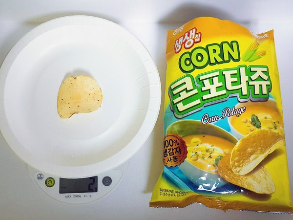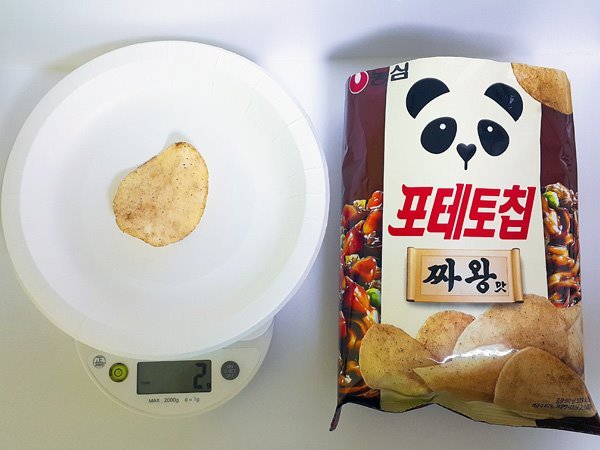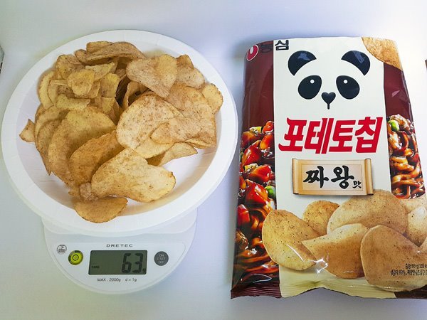 ‘포테토칩 짜왕맛’을 실제로 잰 결과, 1개 중량은 2g, 전체 중량은 63g으로, 기재된 중량에 비해 3g 많았다. 과자의 표면은 짜왕 스프 맛이 강하게 느껴질 것 같았는데 실제로 먹어보니 달지도, 그렇다고 짠 것도 아닌 애매모호한 맛이었다. 짜왕 스프가 아주 덜 들어가서 맛을 느끼려면 입에서 녹이고 있어야 가능했다. 입맛이 너무 나트륨에 길들여져서 맛이 덜 느껴지는 걸까?