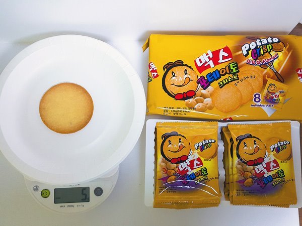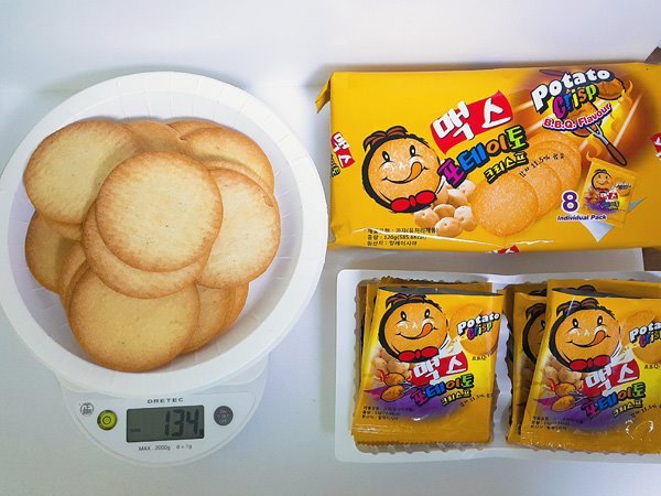 실제로 잰 ‘맥스 포테이토 크리스프’ 1개 중량은 5g, 전체 중량은 134g으로, 기재된 중량과 14g 차이가 있었다. 하지만 앞서 언급했듯 1봉지가 더 들어있어서 중량 차이가 난 것이니 설레면 안된다. 수입 과자 전문점에서 보다가 편의점에서 보니 반갑기 이를 데 없었는데, 이 맛에 중독돼 살이 쪘던 지난날이 떠올랐기 때문이다. 첫 맛은 짠 맛이 사로잡지만 씹을수록 단맛이 진하게 느껴지고, 바삭한 느낌 대신 쿠키를 먹는 느낌이다.