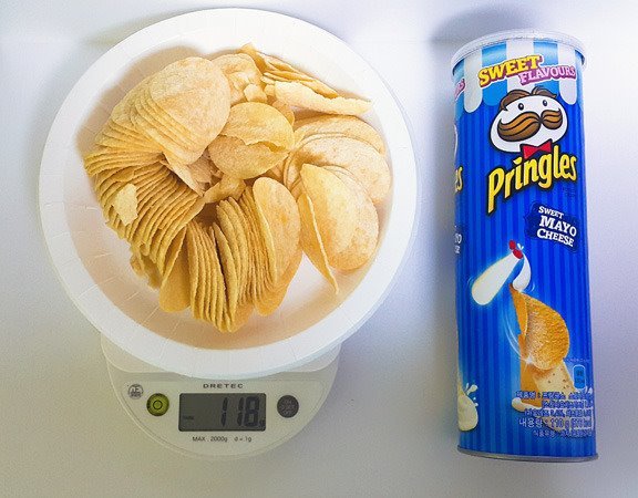 실제로 잰 ‘프링글스 스윗마요치즈’ 1개 중량 1g, 전체 중량은 118g으로, 기재된 중량에 비해 8g 많았다. 음, 이건 조금은 설레도 될 것 같다. 그러나 맛에서 설레면 안 되는 것이라는 걸 한 입 먹고 알았다. 첫 맛은 살짝 맹했고 ‘포테토칩 짜왕맛’을 먹었을 때와 같이 소스 맛이 덜 느껴졌다. 짠 맛도 단 맛도 느껴지지 않았으며, 치즈보단 마요네즈 맛이 좀 더 강해 살짝 느끼했다. 몇 개는 먹을 수 있겠지만 연속적으로 먹기는 힘들 것 같다.